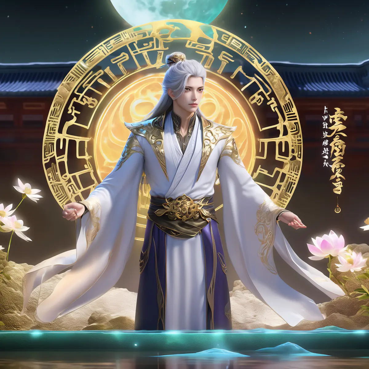 - 服饰:月白鲛绡广袖袍(半透明质感)/金丝蟠龙腰带/赤金步云履