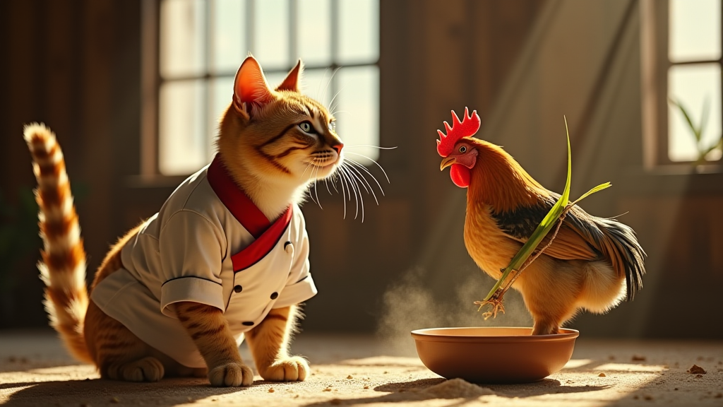 它龇着尖牙紧盯扑棱的芦花母鸡