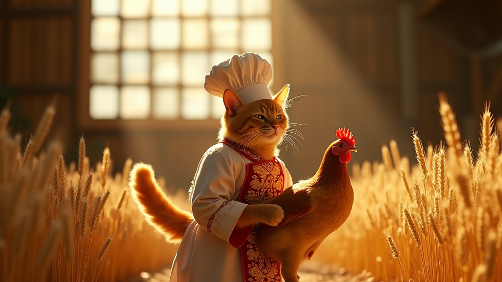 厨师猫抓到了一只鸡