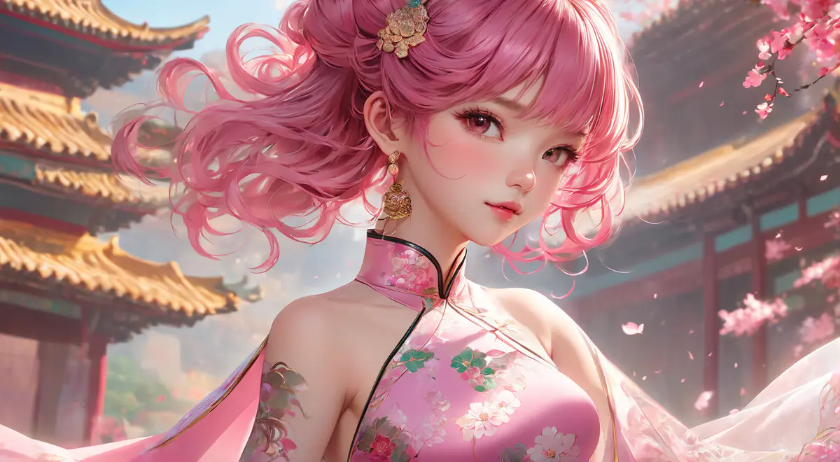 旗袍性感女生,穿白色高叉旗袍,蕾丝披肩,参考崩坏星穹铁道里的符玄(但不要照抄),发型偏可爱一些,瞳孔为粉色,发色也为粉色(鸣潮里的长离那种粉毛)