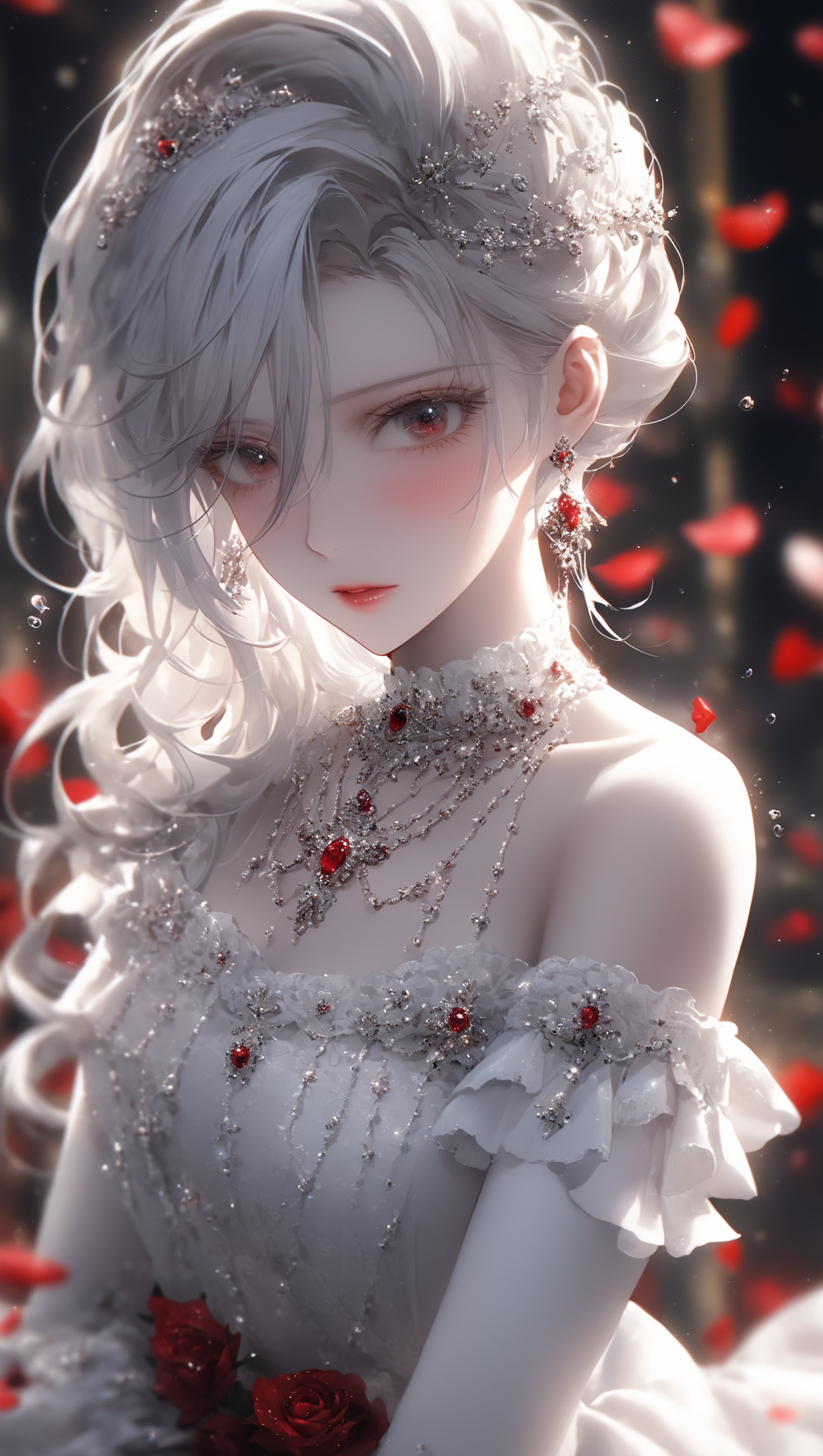 ((头发都在镜头内)),长睫毛,大眼睛,银白色长发,芭蕾舞,赤脚,红墨水,丁达尔效应,长睫毛,嫩白肌肤,极致的面部细节刻画,昏暗灯光,芊芊细腰,孤独,完美容颜,超精细细节,超现实,超高清,面对镜头,大长腿,丝袜,2.5D(((协调的肢体)))