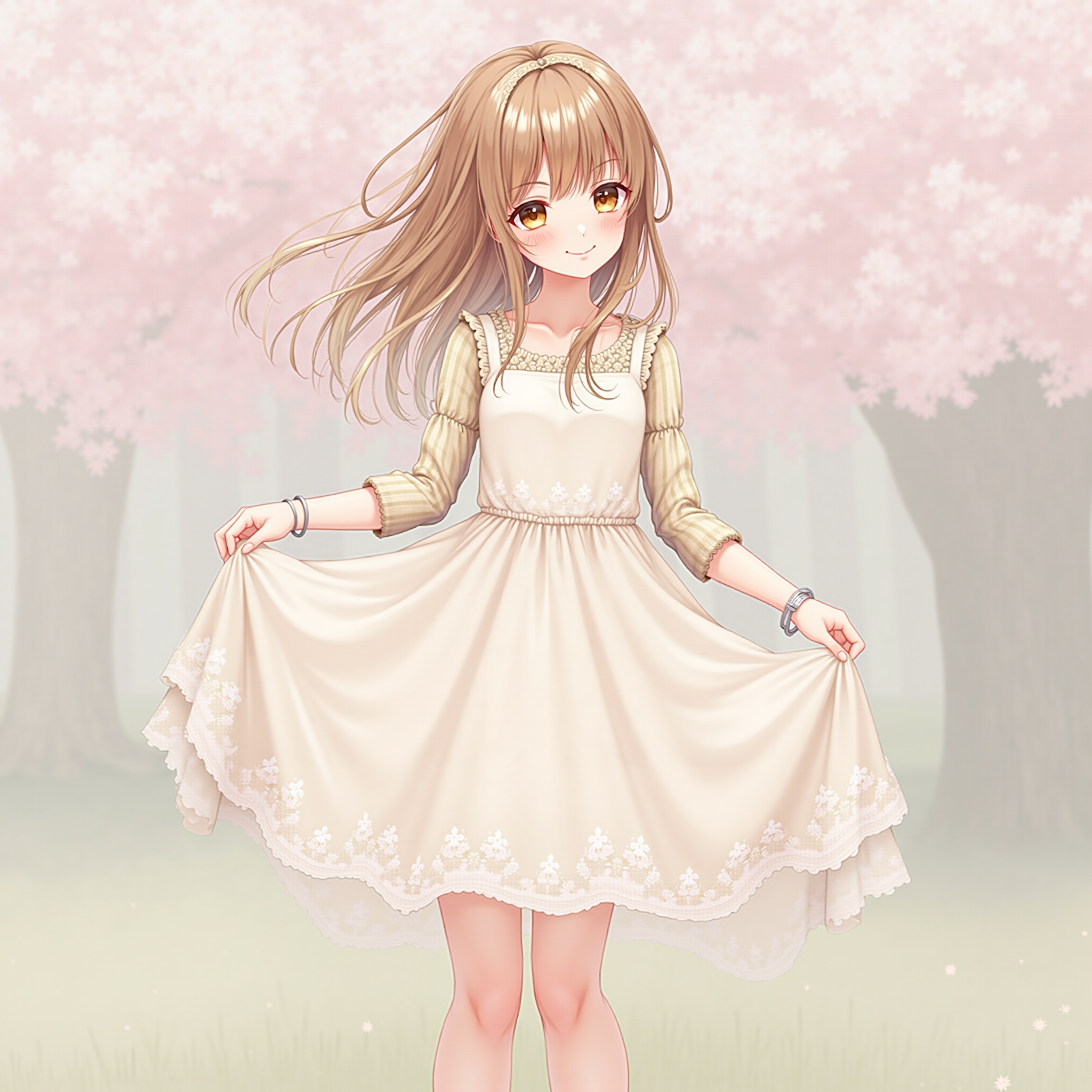 **姿势与氛围:** 少女微微侧身站立, 双手轻轻提起一点点裙摆, 露出穿着小皮鞋和蕾丝袜的纤细脚踝, 眼神清澈带点懵懂和羞涩, 嘴角有温柔浅笑, 背景是春日樱花树下虚化光斑。整体氛围清新甜美, 精致易碎, 充满保护欲, 强调腰臀曲线和蕾丝细节带来的精致感。