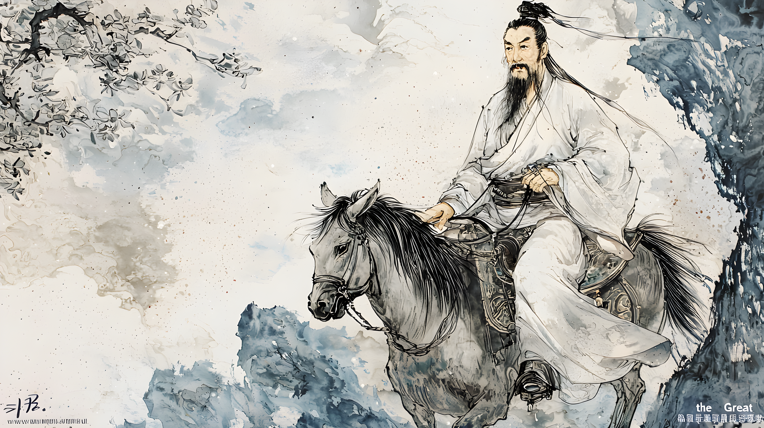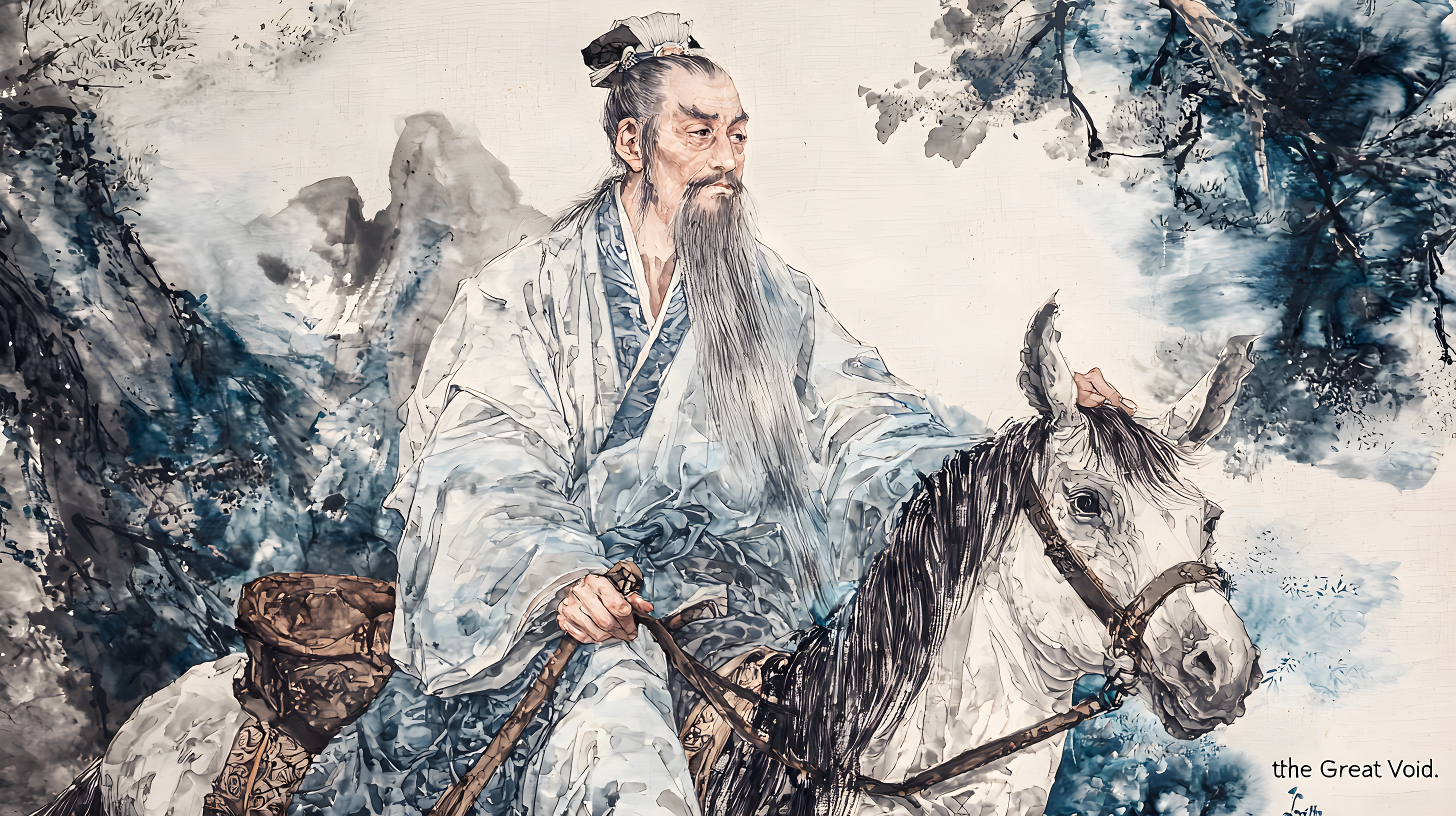宽袍广袖以简笔线条勾勒,衣纹走势如行云流水,通过墨色浓淡表现衣褶的纵深,展现道家朴拙自然的美学追求。侧身骑牛,一手执卷(或扶牛角),一手持杖(或拂尘),身体微倾的动态暗示行路意象,与静态神情形成禅意对比。牛首昂扬向前,犄角以遒劲墨线勾画,躯体用淡墨渲染肌理,兼具力量感与温顺神态。