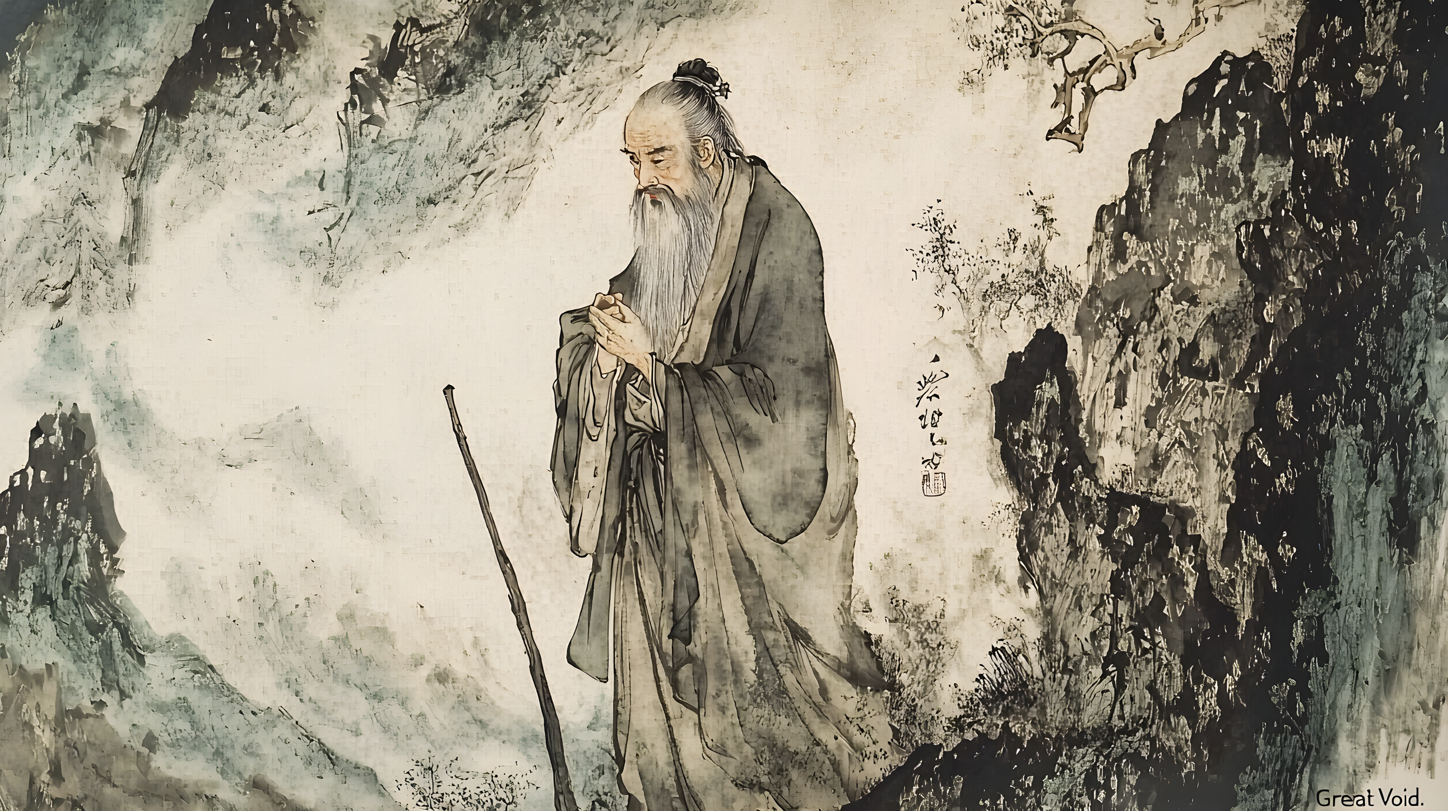 以枯笔淡墨侧锋勾勒山石轮廓,皴法简练,山势险峻却无压迫感,暗喻求道之路的艰深与豁达。画面中上部大面积留白,间以淡墨晕染云气,既营造苍茫时空感,又隐喻“大象无形”的道家哲学。