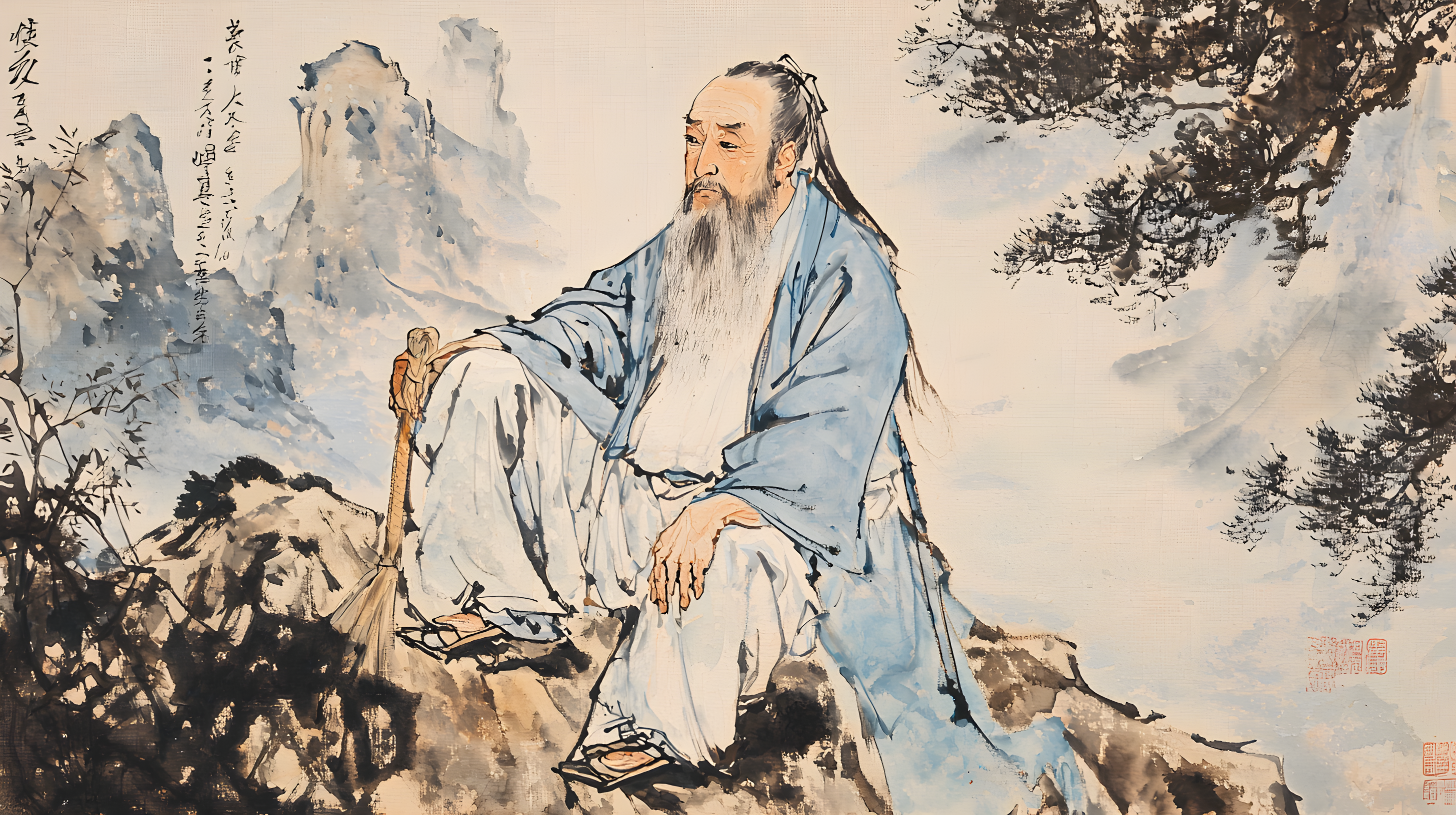 老子长髯垂胸,眉目低垂,呈现深思内敛之态;面容清癯却透露出智者超然物外的气质。