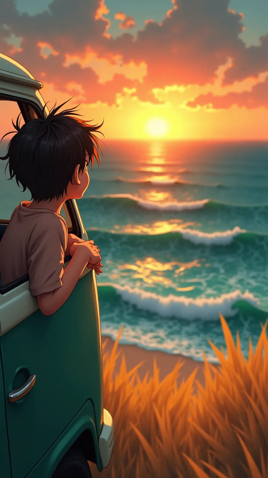 A young boy leans out of a vintage van window, gazing at the sunset over the ocean. Wind blows his messy hair. The scene has a vast coastline with crashing waves, golden grass, and a sky transitioning from teal to orange-red. Japanese anime illustration style, realistic lighting, cinematic colors, warm and healing atmosphere, detailed textures of hair, clothes, and waves. --ar 9:16 --style anime