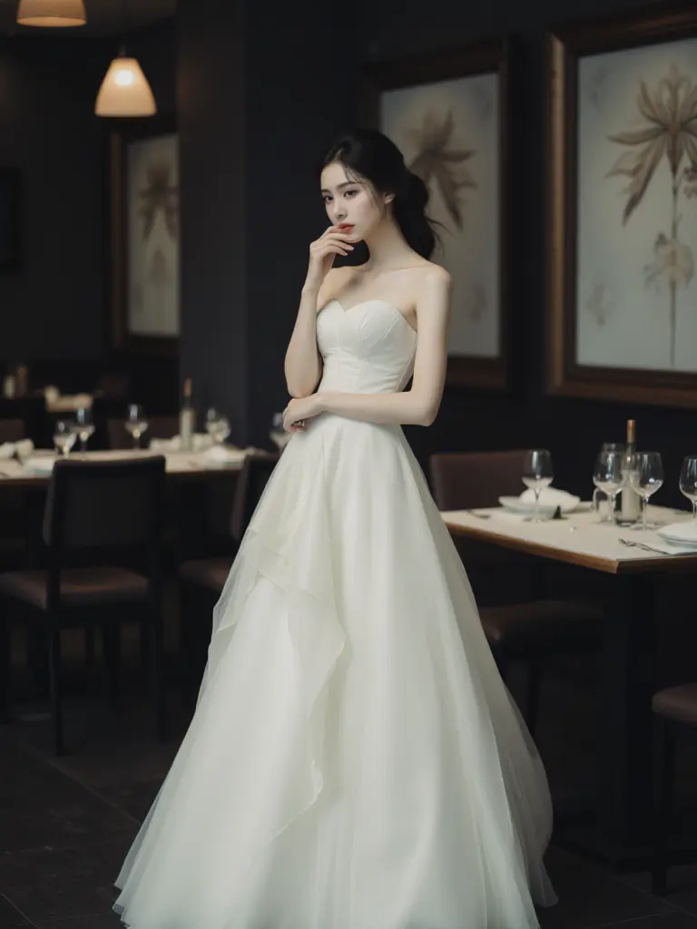 A woman in a strapless white dress with a corset-like top. A restaurant interior featuring tables and chairs, along with wine glasses and bottles. Predominantly shades of black and white, with the woman's dress contrasting against the dark background. Photorealistic photography.