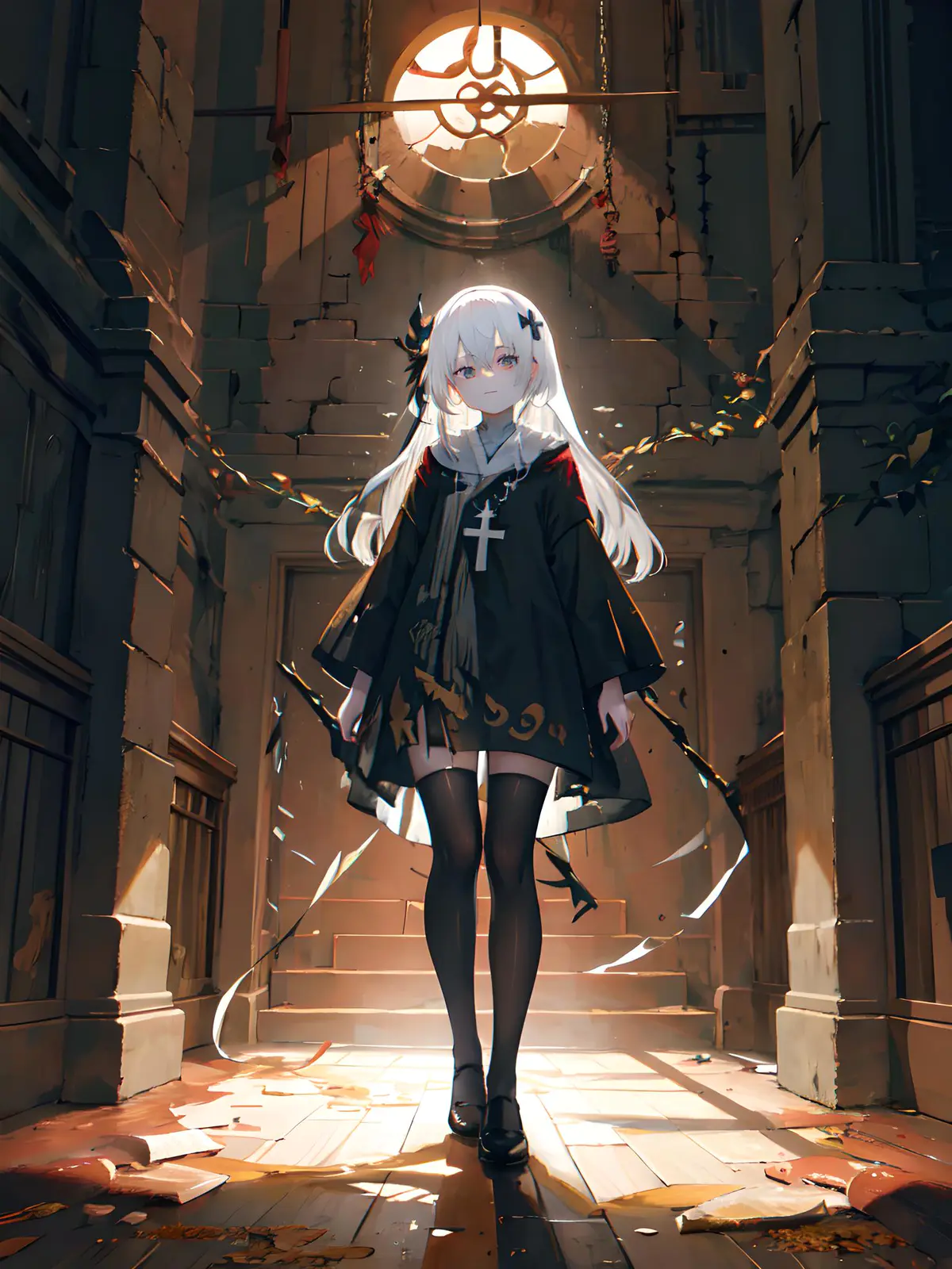 全身照,站立于哥特式破败教堂内,(强烈的戏剧性光影:1.4),一道顶光与侧逆光从破碎的玫瑰窗射入,照亮浮尘与她身体的轮廓,背景是深邃的阴影。空灵,幽邃,神圣与亵渎的极致对比。