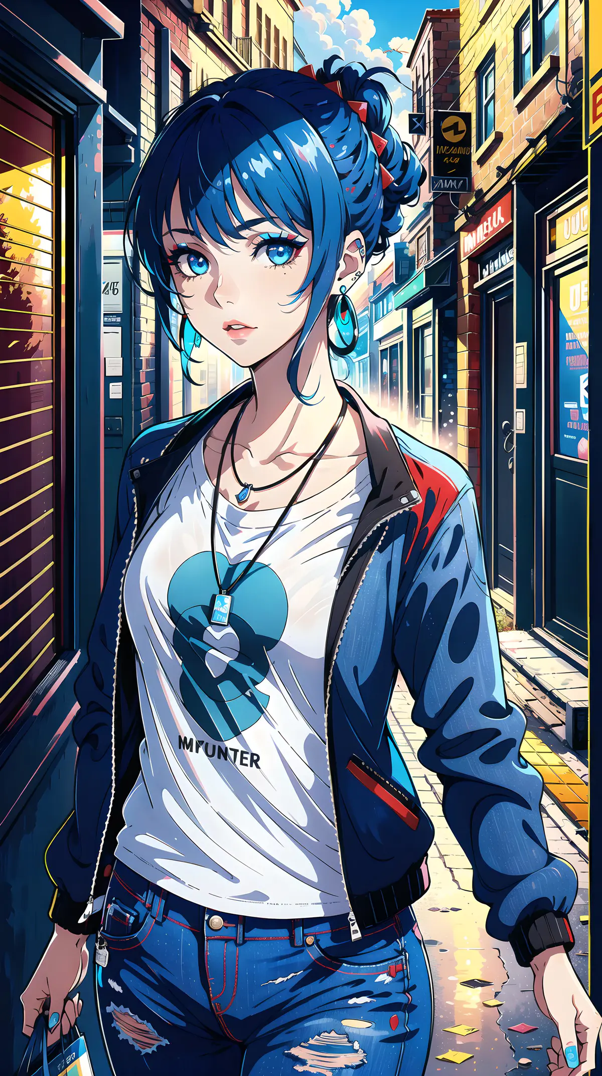 错综复杂,1个女孩在街上,小巷,(1个女孩),(蓝色头发:1.4),(美丽精细的发光蓝眼睛:1.2),化妆,耳环,颈圈,高分辨率,真实感,戏剧灯光,看向观者,T恤,牛仔裤,外套,敞开的外套,漫画,美丽的脸,2.5D