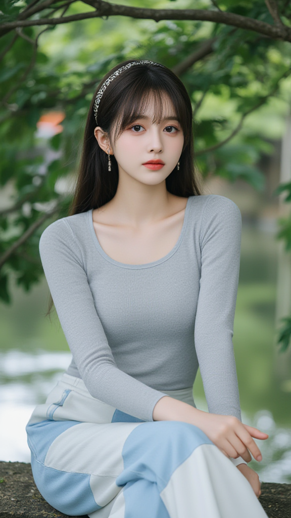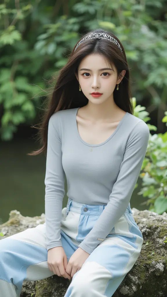 她坐在绿意盎然的户外景致中,长发用带有花纹的发饰束起,更显清新雅致。身着浅灰色的修身长袖上衣,领口的设计简约又精致,搭配浅蓝与灰色拼接的休闲裤,手腕处还点缀着小巧的金色装饰。背景是枝叶繁茂的树木与静谧的水景,清风拂过,整体画面充满了自然的温柔气息,尽显恬静优雅的气质,仿佛将“清风徐来”的惬意氛围尽数融入穿搭与场景之中。