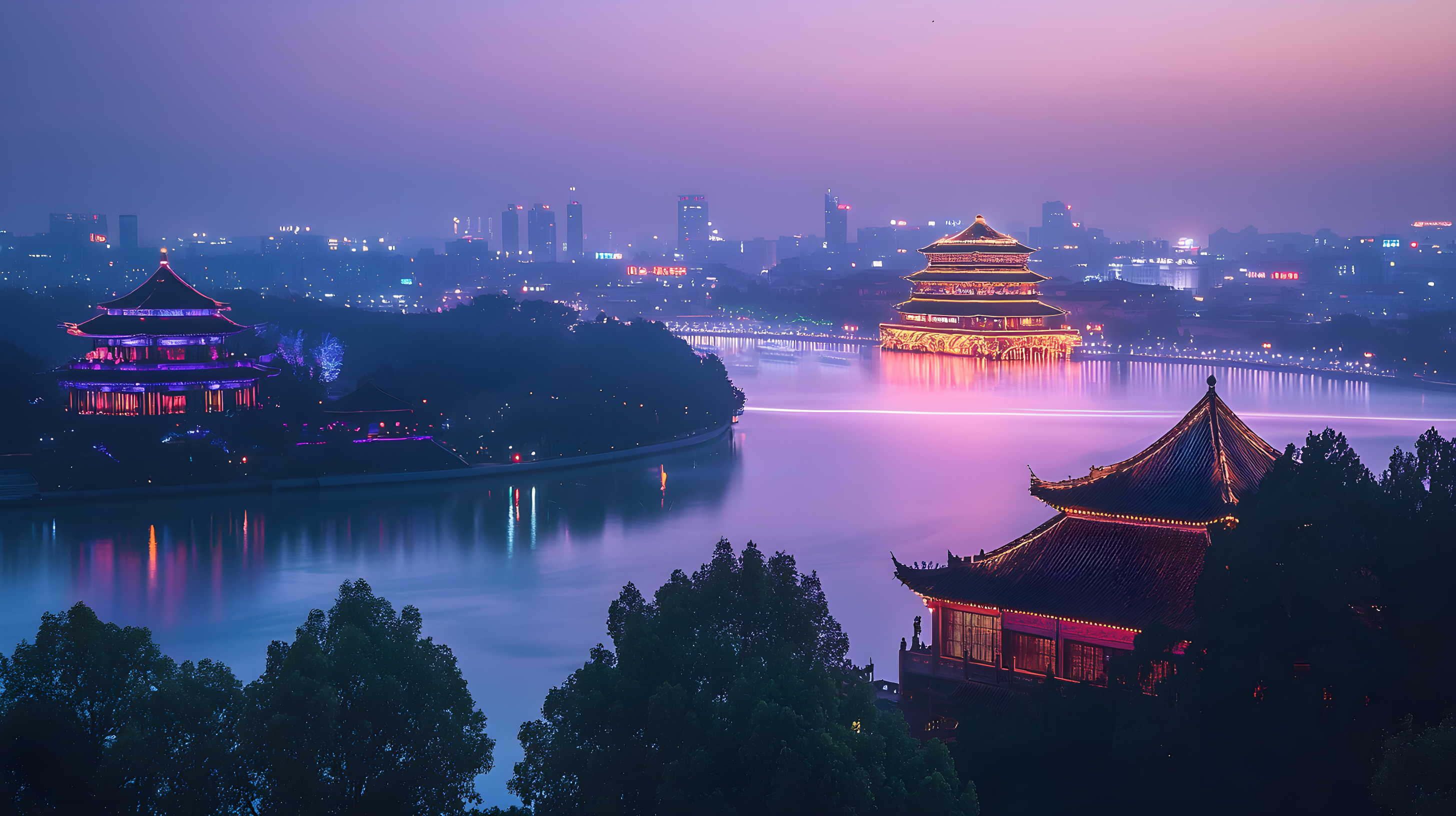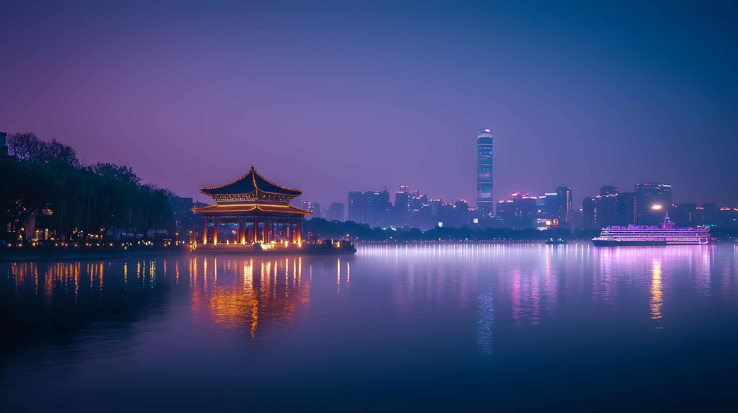 玄武湖在夜色中化作一片墨色绸缎,倒映着对岸的霓虹星河。湖心五洲的轮廓被暖黄色轮廓灯勾勒成水墨画般的岛屿,偶尔有游船划过,拖曳出碎金般的光痕。近岸处,垂柳枝条在射灯下泛着幽绿荧光,与暗紫色夜空的无人机编队灯光秀遥相呼应。湖面雾气氤氲时,灯光晕染成朦胧色块,仿佛莫奈笔下的《睡莲》动态展开。