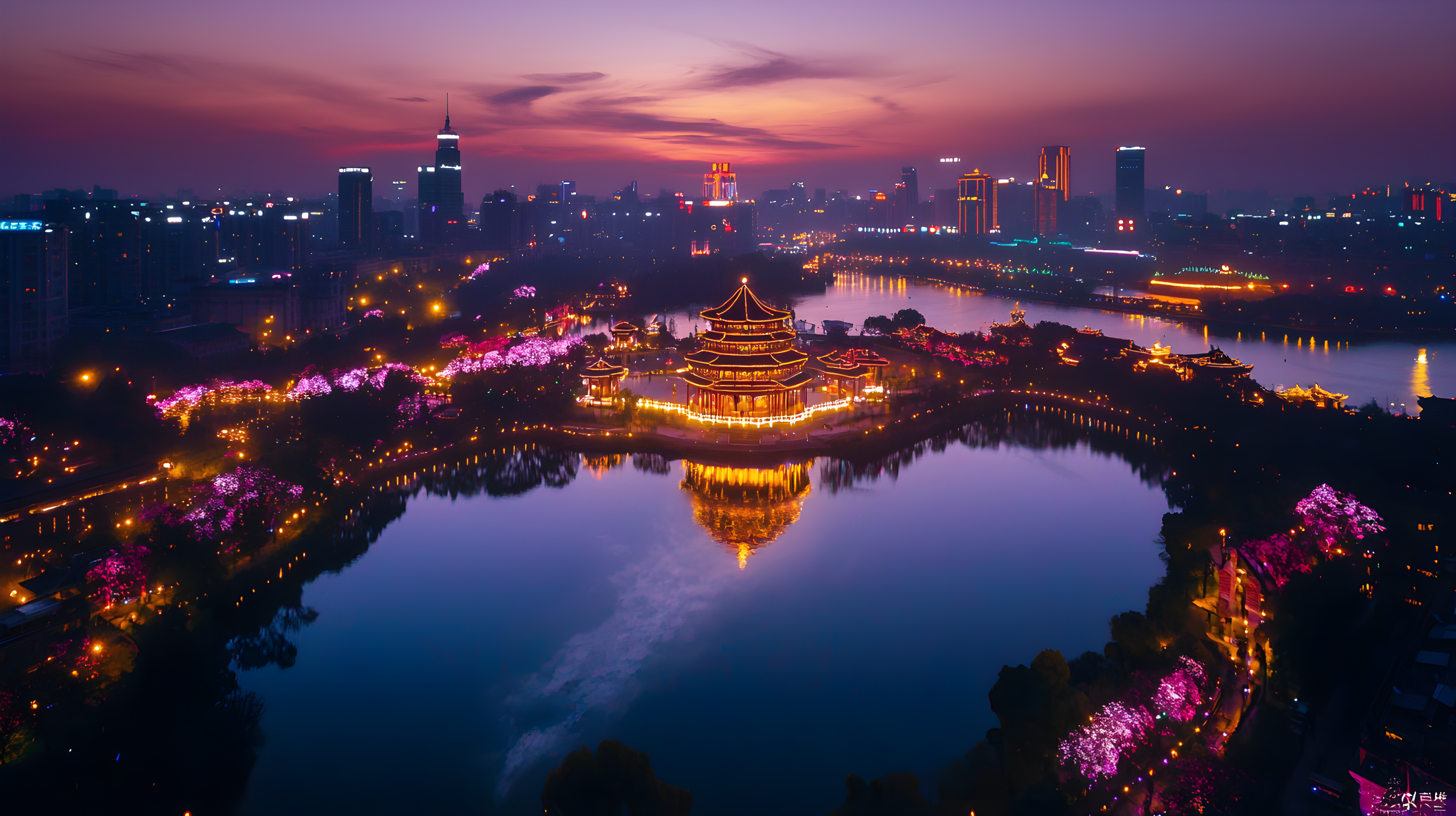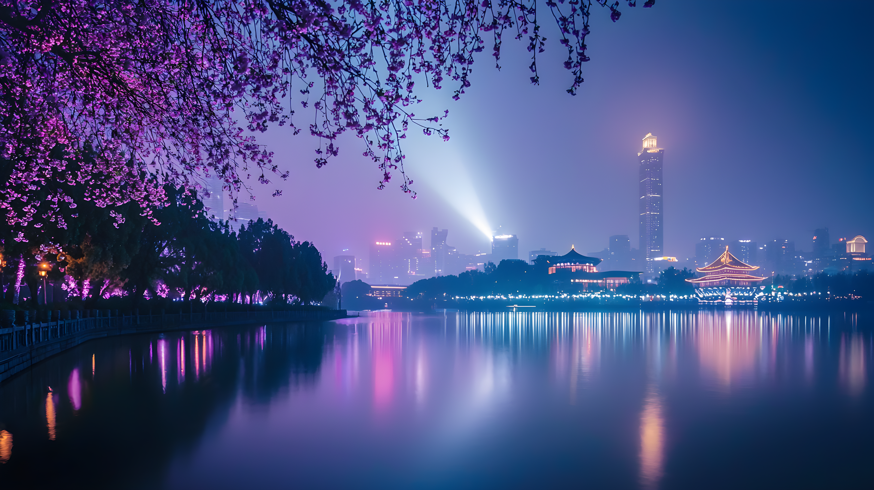 当紫峰大厦顶端的探照灯束突然扫向玄武湖,湖面瞬间腾起一片光雾帷幕,明城墙的激光兽纹此刻投射其上,形成贯穿天、水、城的立体光轨。游船笛声与电子音效混响,夜樱在突如其来的3D投影中反季节怒放——这座城市的夜晚,正在用光之笔触撰写一部未来古典主义史诗。