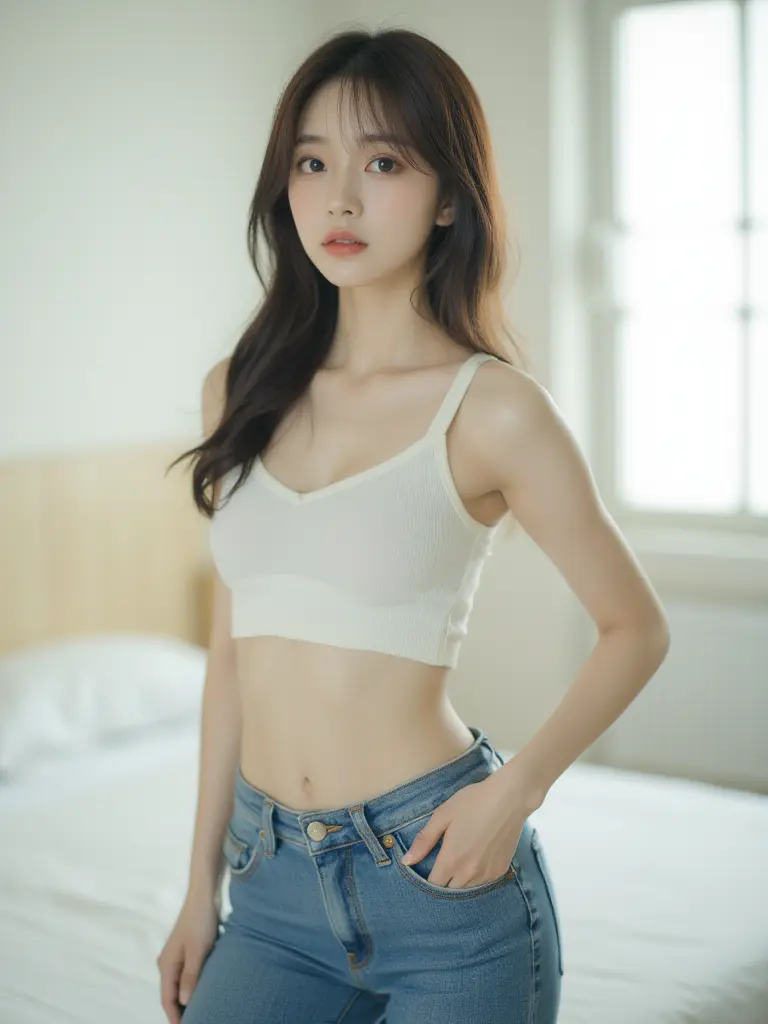 A woman in a casual outfit, including a white crop top and blue jeans. Interior setting with a window and bed visible behind her. Predominantly white and beige tones, soft lighting. Photographic image.