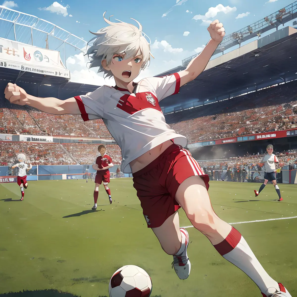 wide angle shot, a 12-year-old boy with white hair and red pupils, in sports shorts, joyfully kicking a soccer ball on a field, crowded stadium with spectators in the background, high detail, vibrant colors