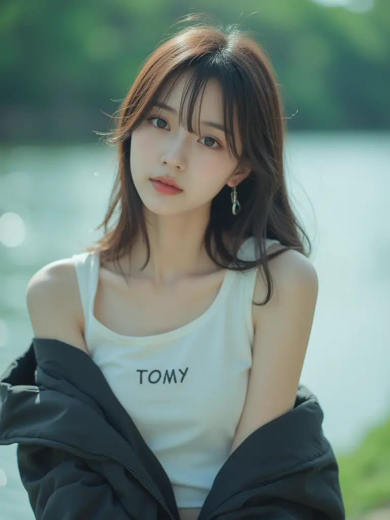 A woman in a white tank top with the word "TOMY" and a black jacket. A serene outdoor setting near water, possibly by a lake or river. Predominantly green and blue tones from nature, with a casual and relaxed vibe. Photographic image.