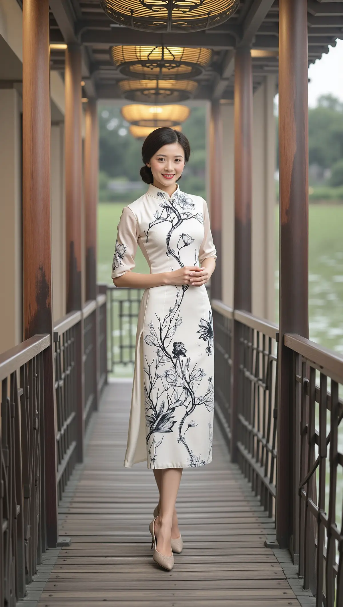 江南小镇,一座小桥上,站着一位美丽的女士,五官精致,微笑面对镜头,身穿白色水墨色旗袍,浅色高跟鞋,水墨画与旗袍的结合,不仅仅是视觉上的叠加,更是两种艺术形式的相互成就。它让旗袍不再只是一件衣服,东方之美。