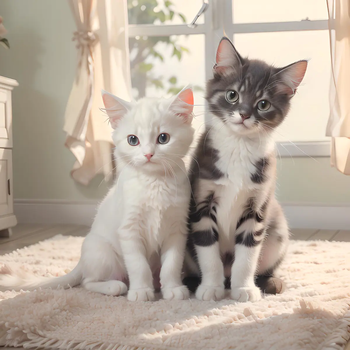 第二只小猫:主要是黑发和白色斑点、粉色鼻子、亮蓝眼睛、黑色爪子、白色尾巴、白色耳尖姿势:开玩笑的摔跤姿势,一只小猫在另一只小猫身上晃动,爪子交织在一起,尾巴弯曲,耳朵向前,快乐情感环境:柔软的毛绒地毯,散落的玩具鼠标,背景上的球,窗户散发的自然光:明亮的自然阳光,柔和的阴影,毛皮上的亮点,吸引它们眼睛的光技术:聚焦小猫,运动时轻微的运动模糊,精致的毛皮纹理,微距摄影风格,浅景深,清晰度高,完美的曝光心情:有趣、活力、清新、温暖、家庭幸福