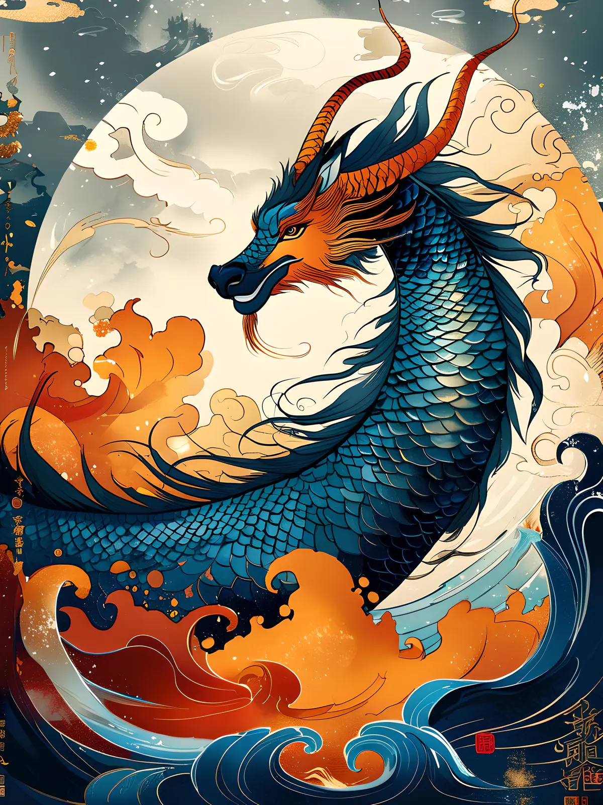 高品质摄影质感与水墨技巧结合,3D立体感,大师插画,厚涂,写实,抓拍,画面冷暖强烈对比,精致刻画,广角,极高色彩饱和度,反光,反射,肌理感,模糊感,颗粒感,高级,暗部叠加,超低角度仰视镜头,细节清晰。元代釉里红巨大妖兽,前面坐着凌乱长发帅气盔甲将领,手握插地长剑,正面镜头。麒麟的图片,蓝色龙头,亮金色龙角,蓝色龙须,龙头毛发飘舞,身体像狮子,但是全身覆盖湛蓝色龙鳞,从水中走出来,威严,睥睨天下,周围水汽升腾,背黑云缭绕,四个蹄子都缠绕着水流。