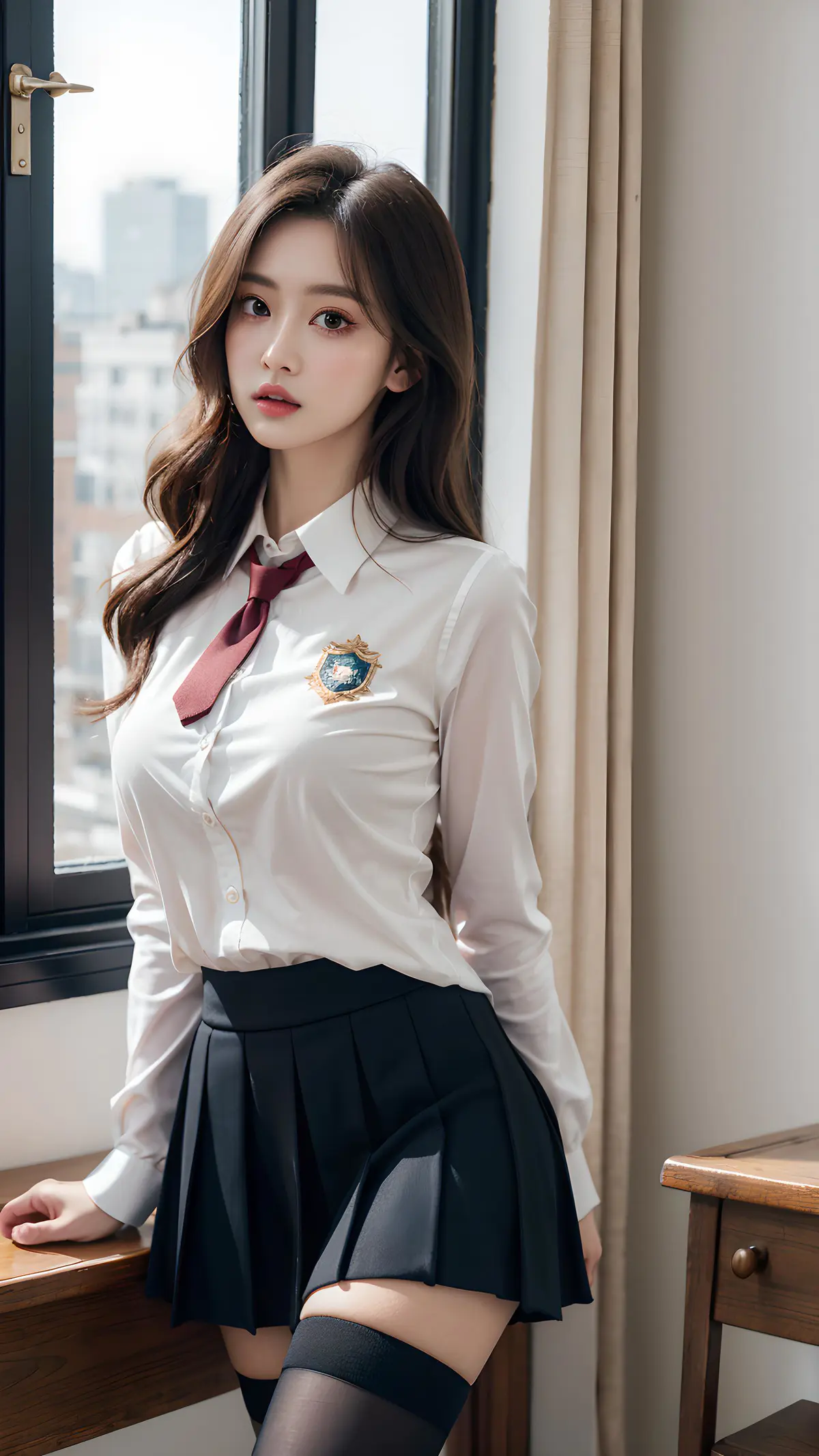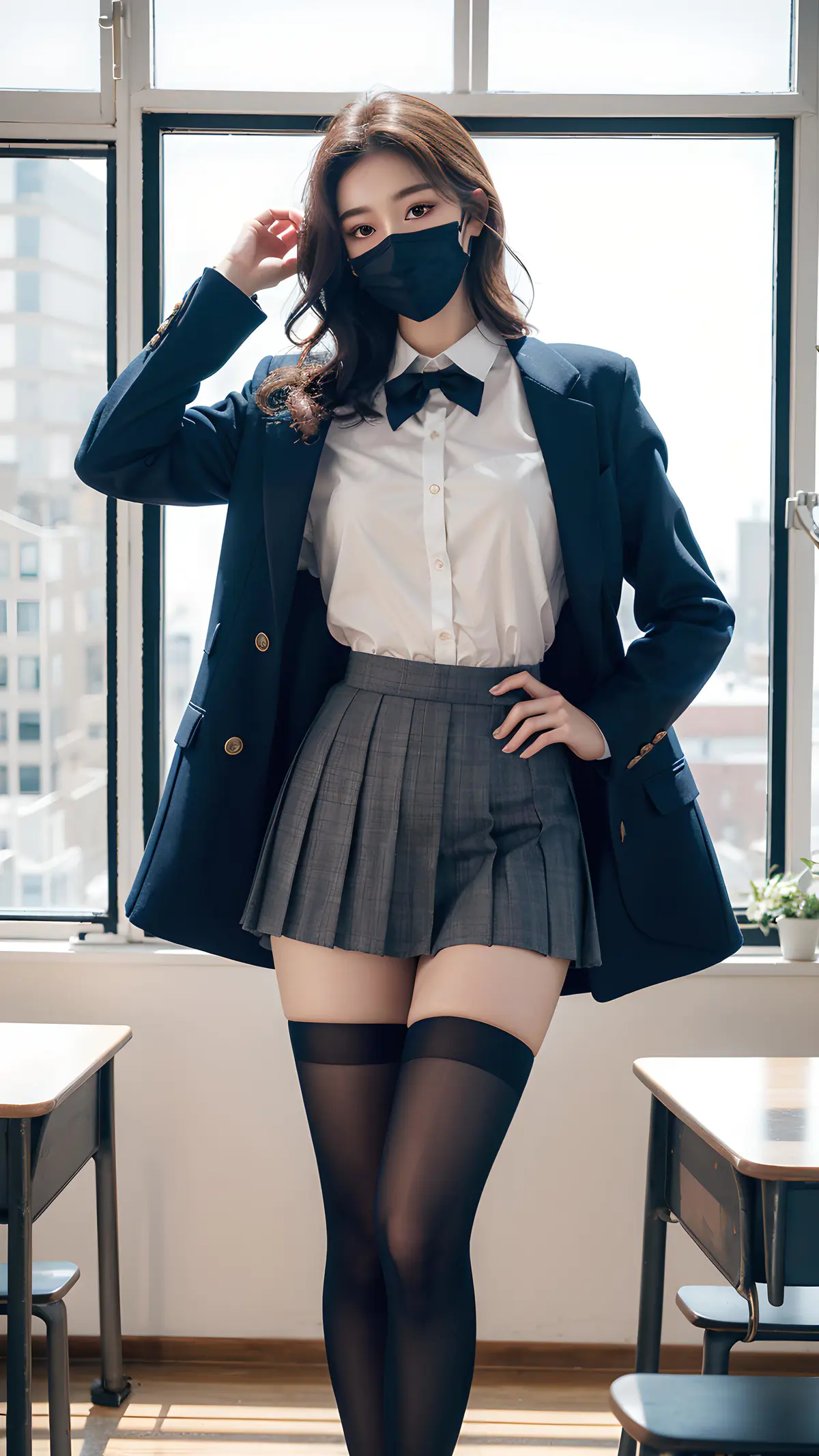 高反差,摄影,名作,细部,女孩,五官精致,美女,双眼皮,大眼睛,长睫毛,蓝色瞳孔,高鼻梁,嘴唇微开,嘟嘟唇,淡妆,长腿美,棕色头发,烫发,戏剧性灯光,身材修长,温柔,迷离,暧昧,性感,潮红,朦胧,全景,塑身,高级感,唯美,长发,法式,卷发,翘臀,蕾丝,互动,清纯,jk制服,jk短裙,连体黑丝袜,定制,教室里,戴口罩,学生,上课,英语课,文静,害羞,校服,低头