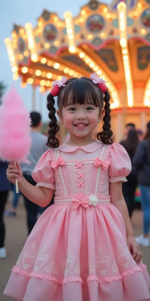 照片中的萌妹子穿着粉色的洛丽塔裙,上面有很多精致的蝴蝶结和蕾丝装饰,裙摆蓬松。她扎着双马尾,发梢微微卷曲,还别着两个大大的草莓发夹。他笑容甜美,眼睛弯弯的像月牙,手里拿着一个粉色的棉花糖,站在游乐园的旋转木马前,周围是五彩斑斓的灯光和欢乐的人群。
