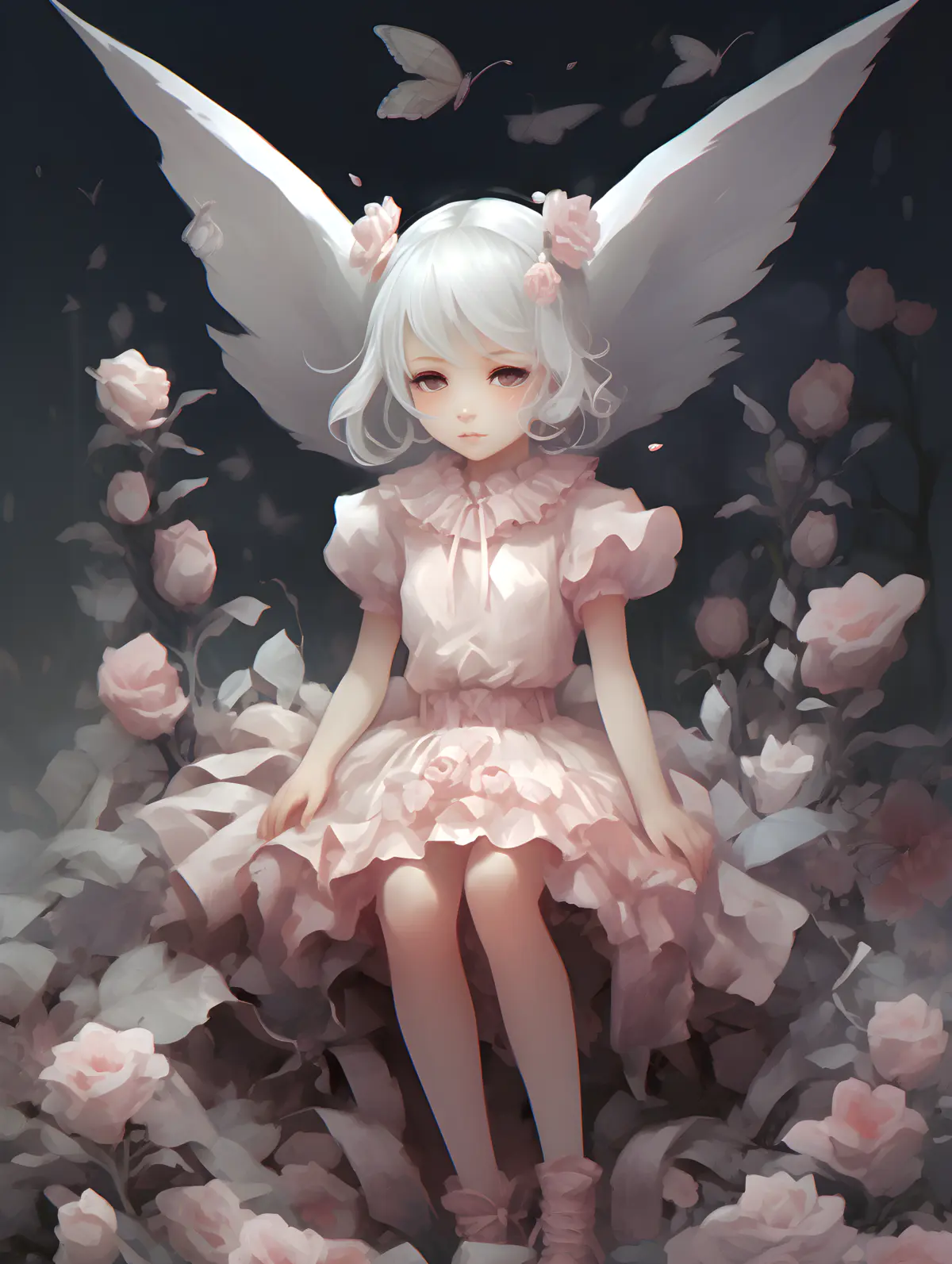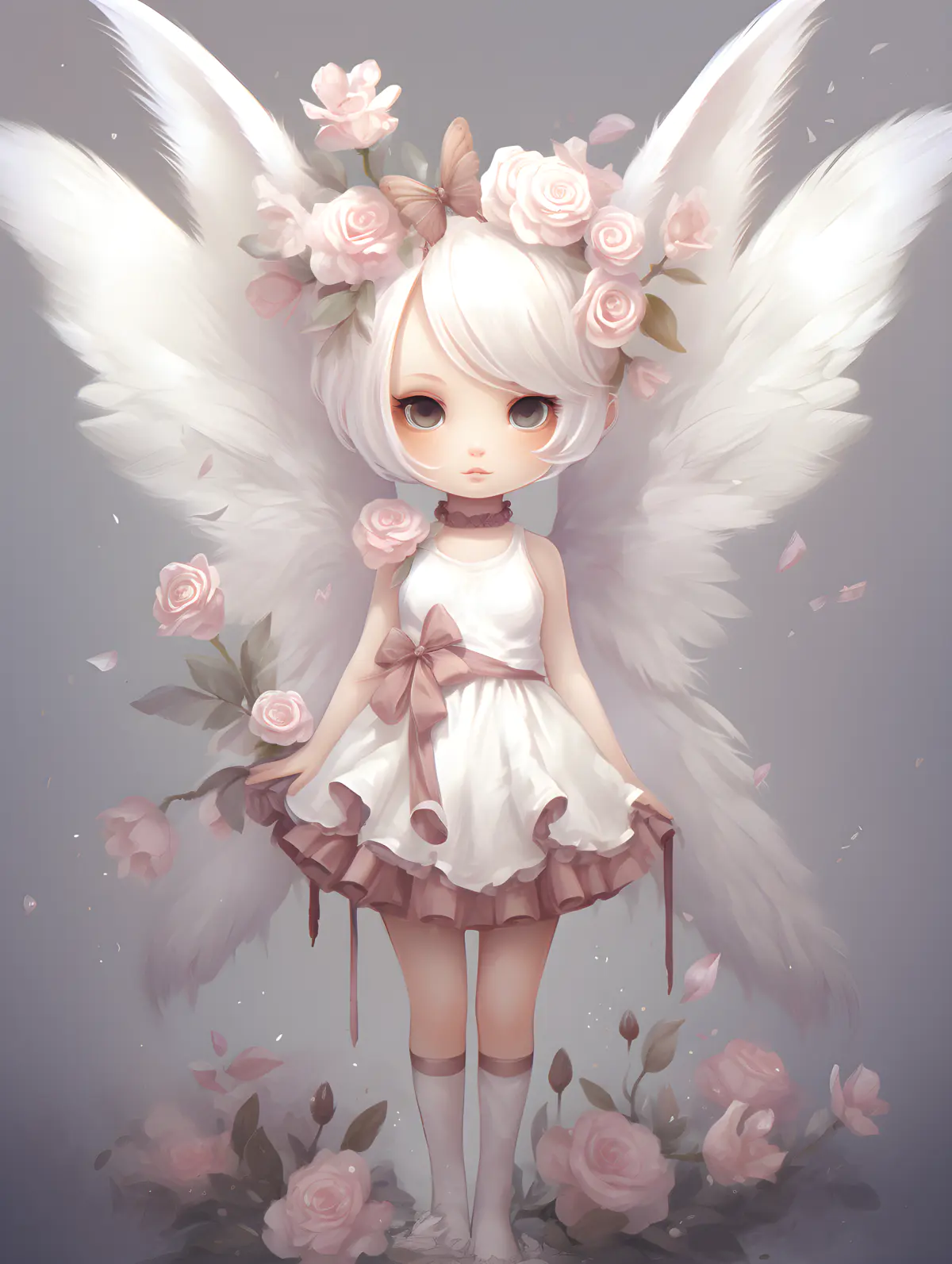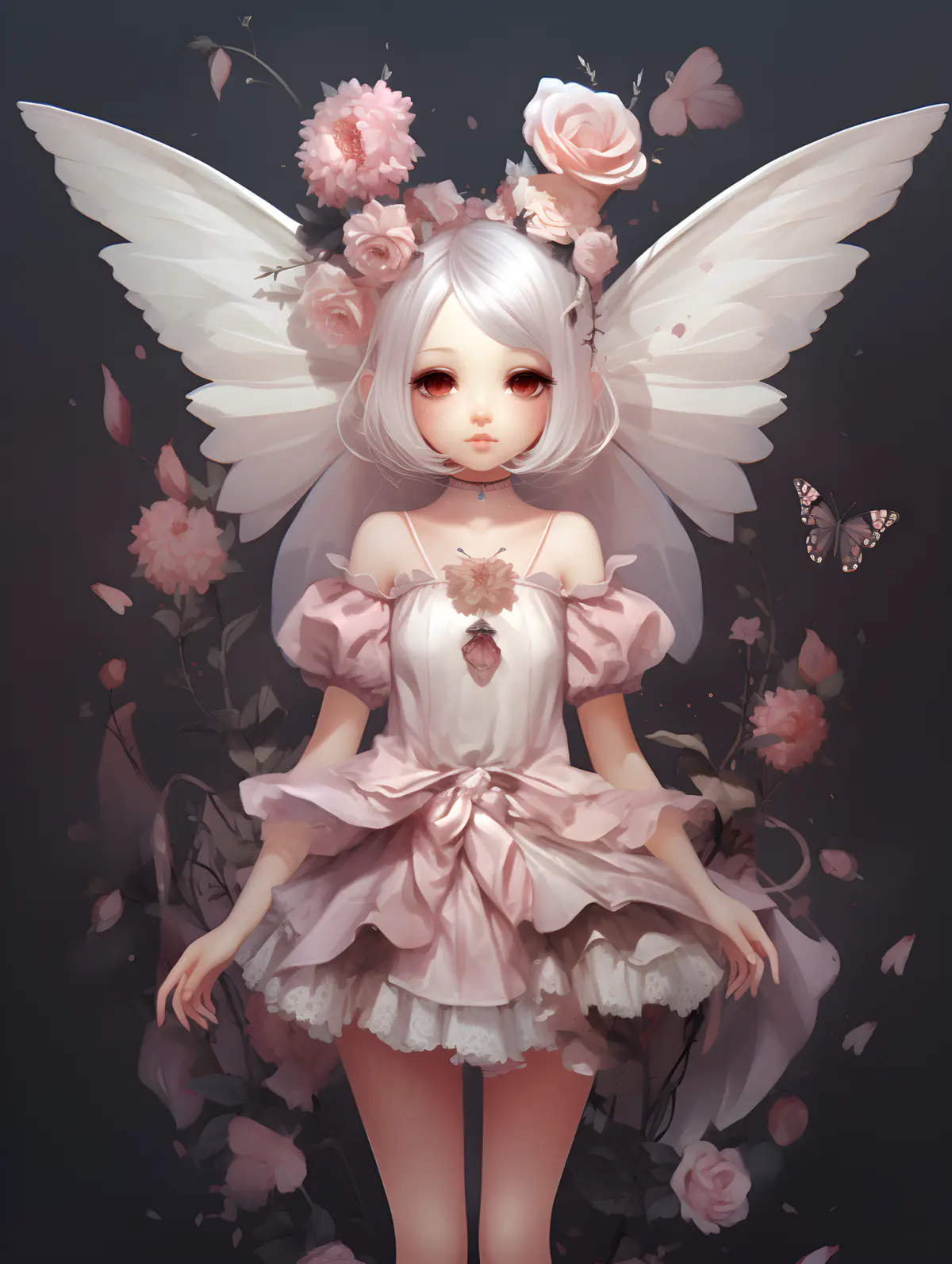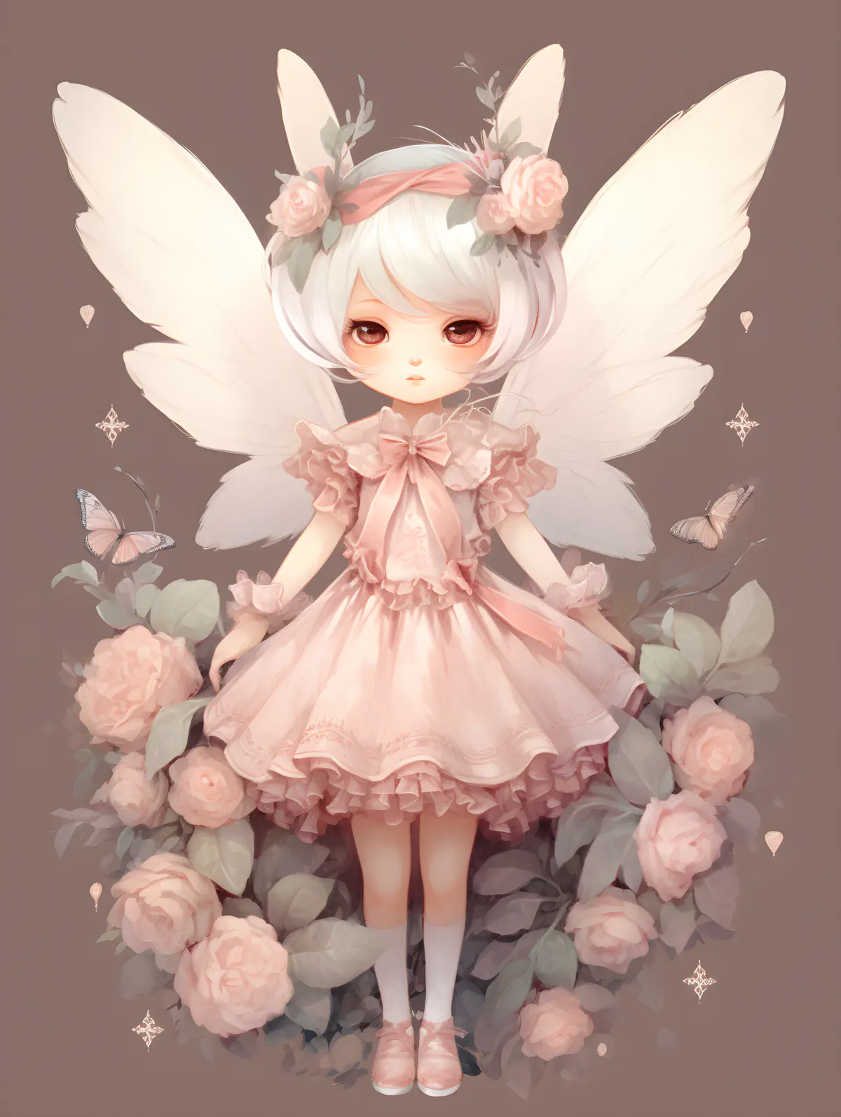 1girl, solo, blush, short hair, simple background, hair ornament, dress, animal ears, standing, full body, closed eyes, flower, white hair, boots, wings, artist name, signature, hair flower, grey background, rabbit ears, pink dress, pink flower, personification, fairy