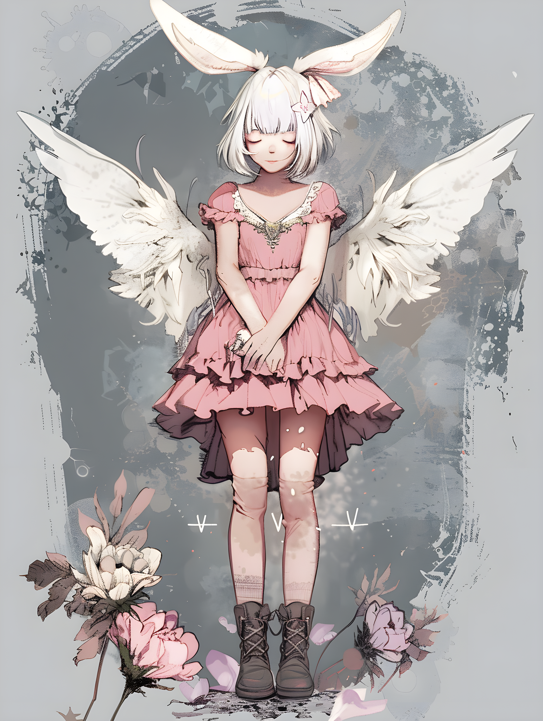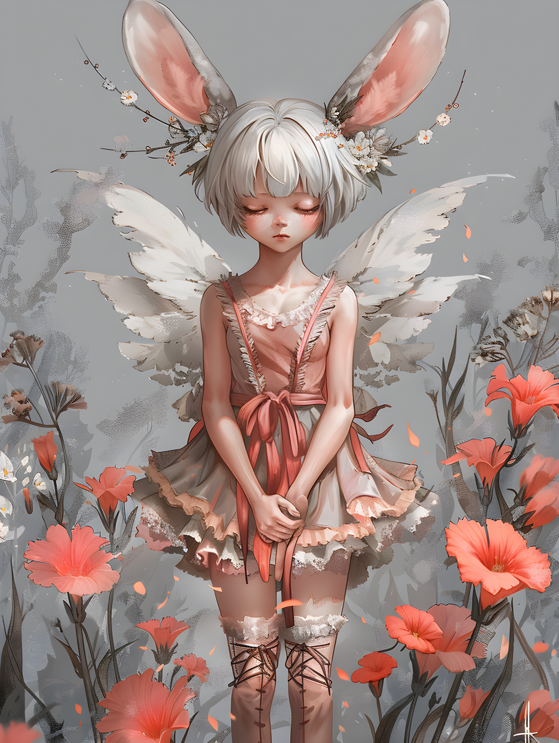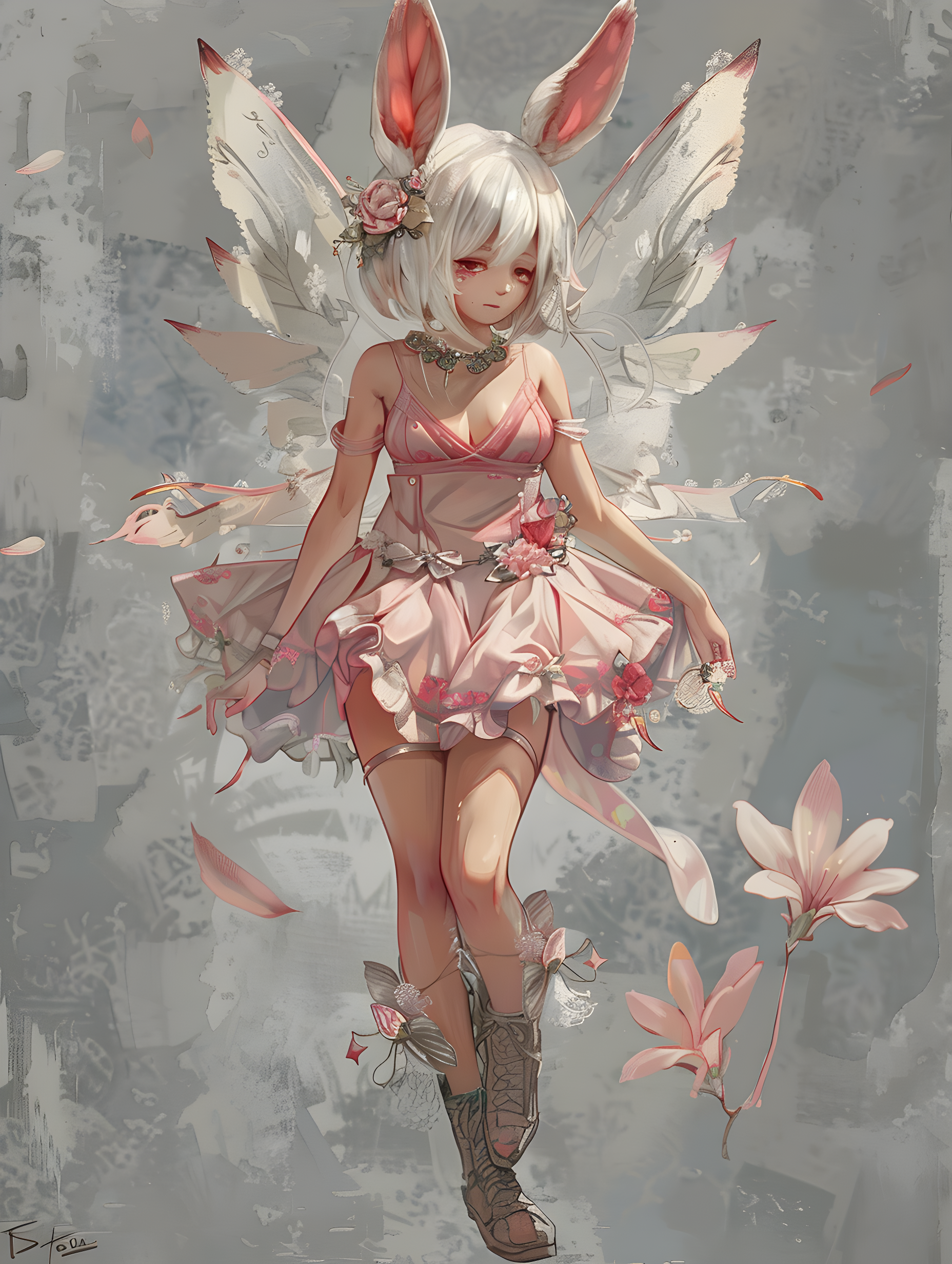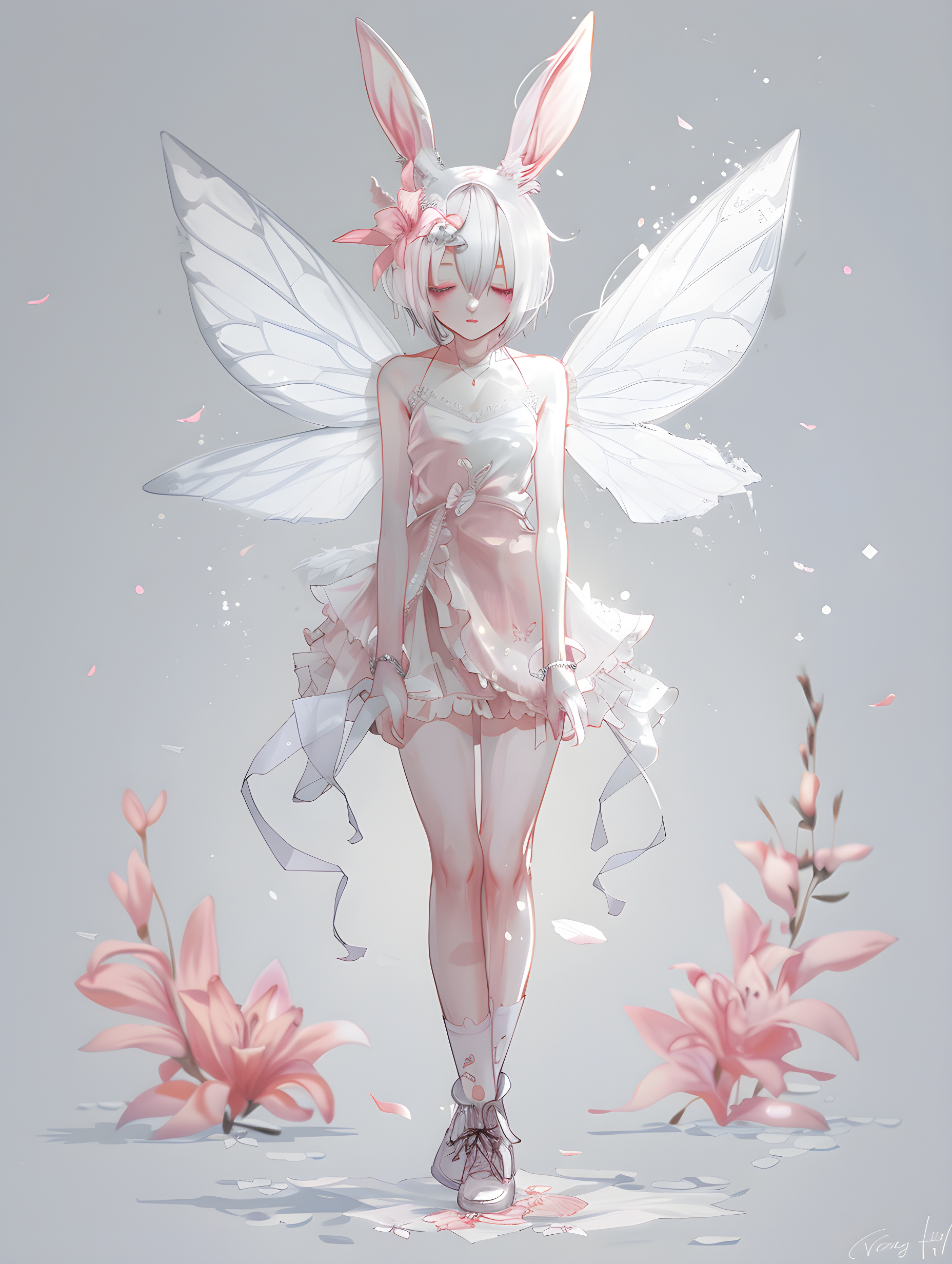 1girl, solo, blush, short hair, simple background, hair ornament, dress, animal ears, standing, full body, closed eyes, flower, white hair, boots, wings, artist name, signature, hair flower, grey background, rabbit ears, pink dress, pink flower, personification, fairy