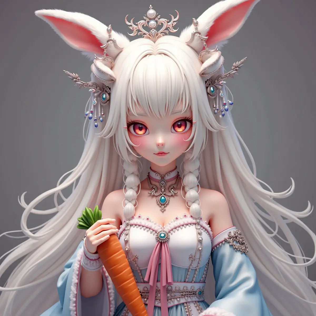 图片风格为CG 厚涂,游戏CG ,丰富的色彩层次,质感细腻,真实光影,精致的细节。,生成一张,bjd娃娃脸,兔妖,白色双环鬓长发,编发,发丝细腻,容貌绝美,毛绒白粉色兔耳,额头上有红色印花,妖治,桃花眼,淡粉色瞳孔,银饰流苏头帘,白蓝渐变色广袖银饰洛丽塔裙,粉色丝带,毛绒披肩,水晶流苏点缀,宝石项链,繁华的银饰凤冠发饰,白色绒球在发饰上点缀,绒球宝石手链,手拿一个大胡萝卜,奇幻,超清。图片风格为CG 厚涂,比例 9:16。