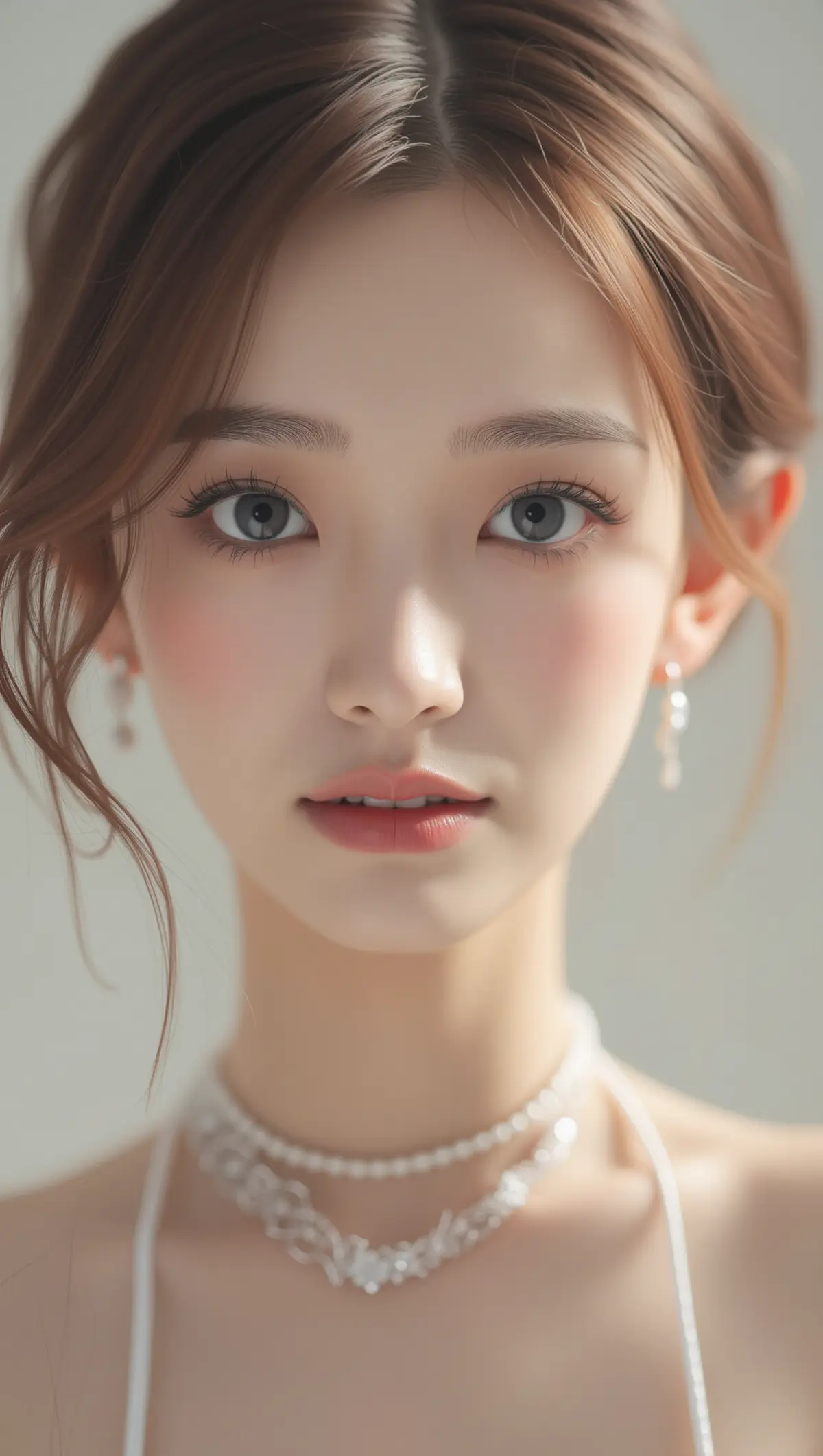 特写拍摄一位年轻东方女性,她有清透白皙的肌肤,眉毛纤细且眉尾微微上扬。大而明亮的蓝灰色眼眸,眼妆为大地色系,睫毛纤长卷翘。鼻梁高挺,唇形饱满,涂着淡粉色的唇彩。发型是半扎发,散落的发丝自然垂在脸颊两侧。耳朵佩戴着精致的钻石花朵耳钉,脖颈处戴着多层链条项链,其中一层链条上串着珍珠,她穿着简约的白色吊带,背景虚化呈柔和的浅色调。