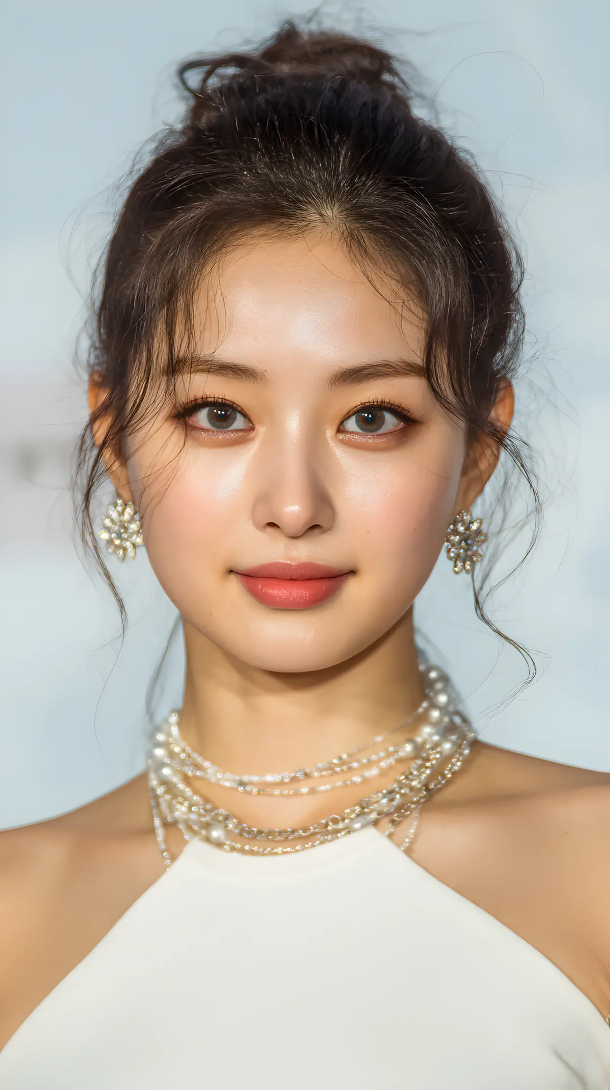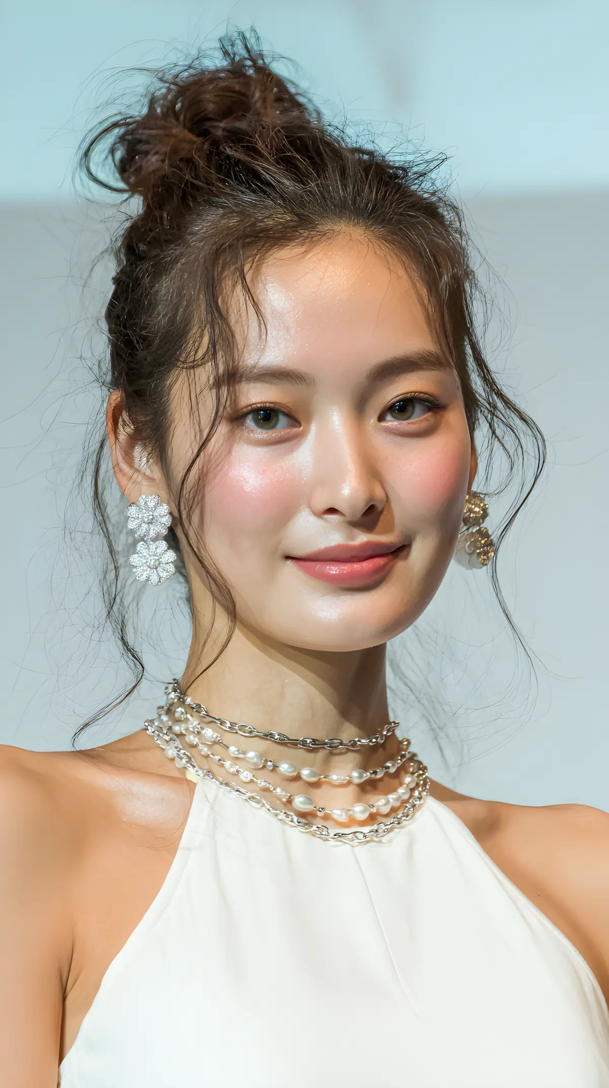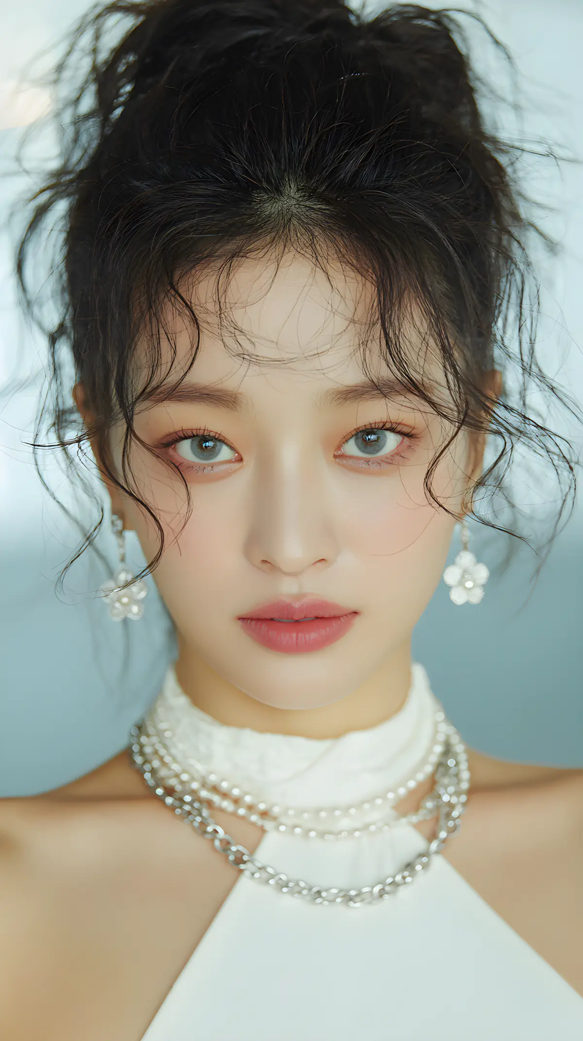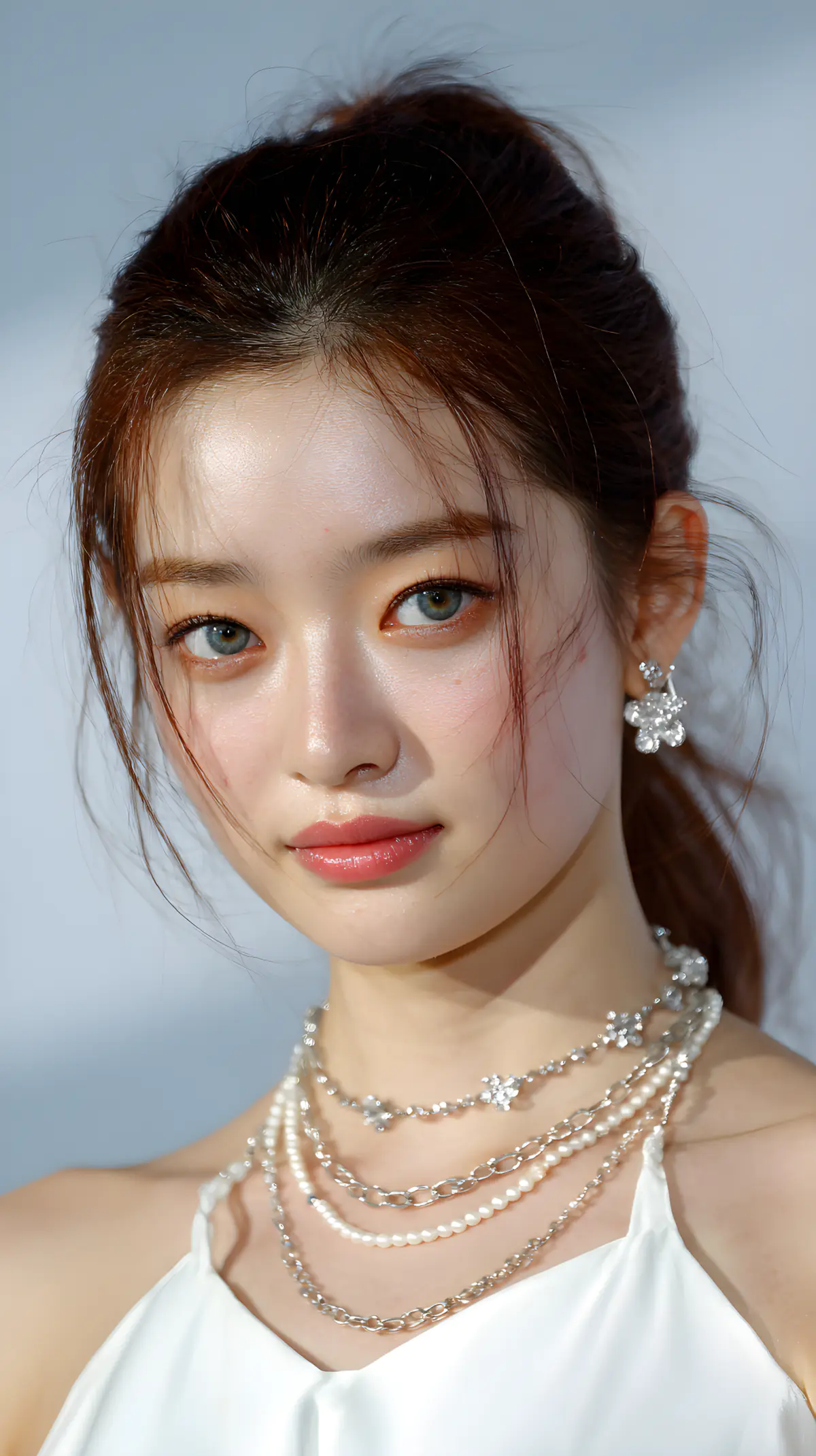 特写拍摄一位年轻东方女性,她有清透白皙的肌肤,眉毛纤细且眉尾微微上扬。大而明亮的蓝灰色眼眸,眼妆为大地色系,睫毛纤长卷翘。鼻梁高挺,唇形饱满,涂着淡粉色的唇彩。发型是半扎发,散落的发丝自然垂在脸颊两侧。耳朵佩戴着精致的钻石花朵耳钉,脖颈处戴着多层链条项链,其中一层链条上串着珍珠,她穿着简约的白色吊带,背景虚化呈柔和的浅色调。