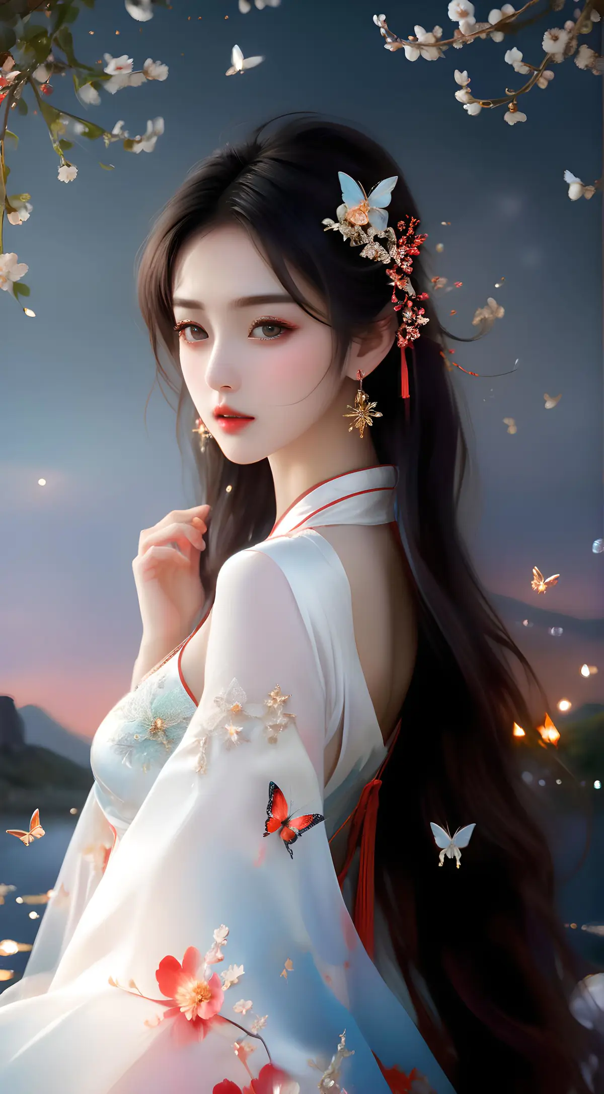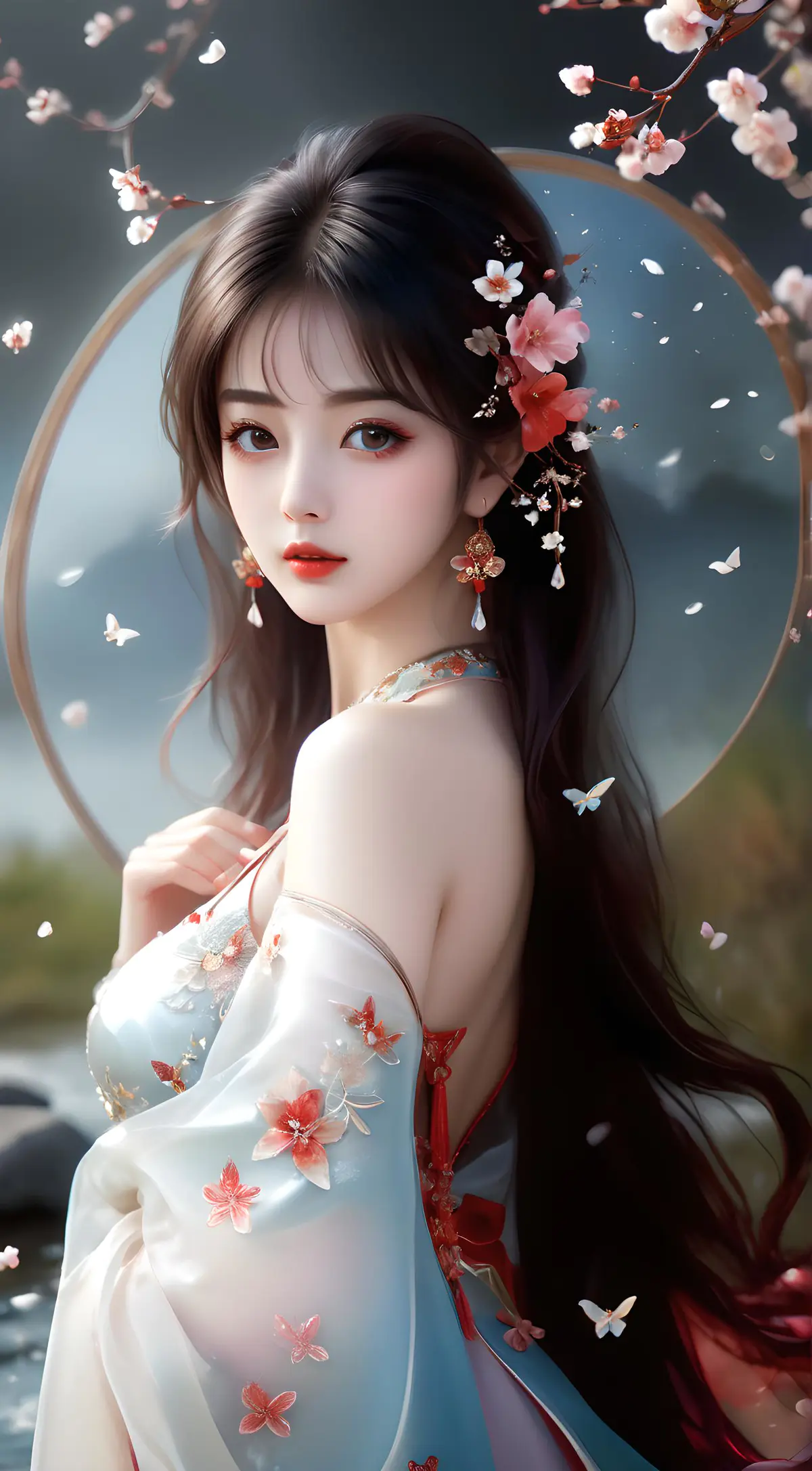 少女,挺胸丰满,多层透明丝绸全身镜,奢华丝滑亮红色雪纺泛光透视(幻彩,闪光,超薄,柔软,透明)液态汉服,云层,云彩,细节真实感,五官完美,特写明亮的大眼睛,胸部大,看着镜头,超细节,脸部细腻,超高清,真实皮肤,全身照,全身镜,高清照片,耳环