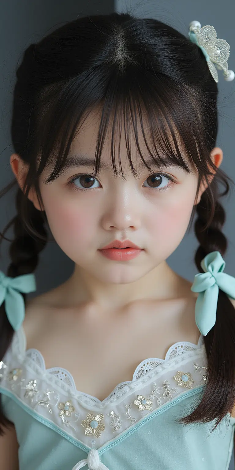 真人写实,1-year-old children, A little girl child,小孩圆脸,用两个小蝴蝶结固定双马尾,长发,很瘦很瘦,完美五官,精致的脸,文胸,深V型,图案刺绣,中式,可爱型,漂亮的,在闺房里,瓜子脸型,尖下巴,瘦脸,网格,蕾丝,头戴发夹,发花,妩媚与清冷并存,光晕,逆光效果,绝美,以超高清画质近距离特写聚焦小女孩,小女孩五官精致得宛如精雕细琢,面容超级漂亮,蓝绿青渐变色,遍布亮片,亮闪闪的效果,绝美,荧光照射,发光,娇小玲珑,娇小型,太瘦了,眼影,明亮通透,皮肤有光泽,成语字幕写在右上角