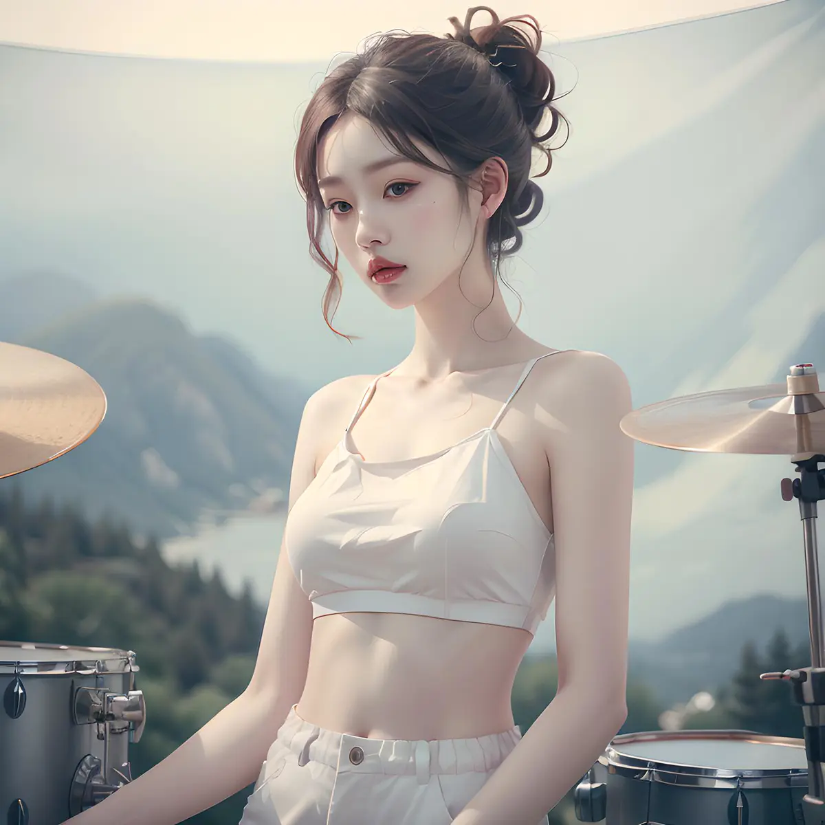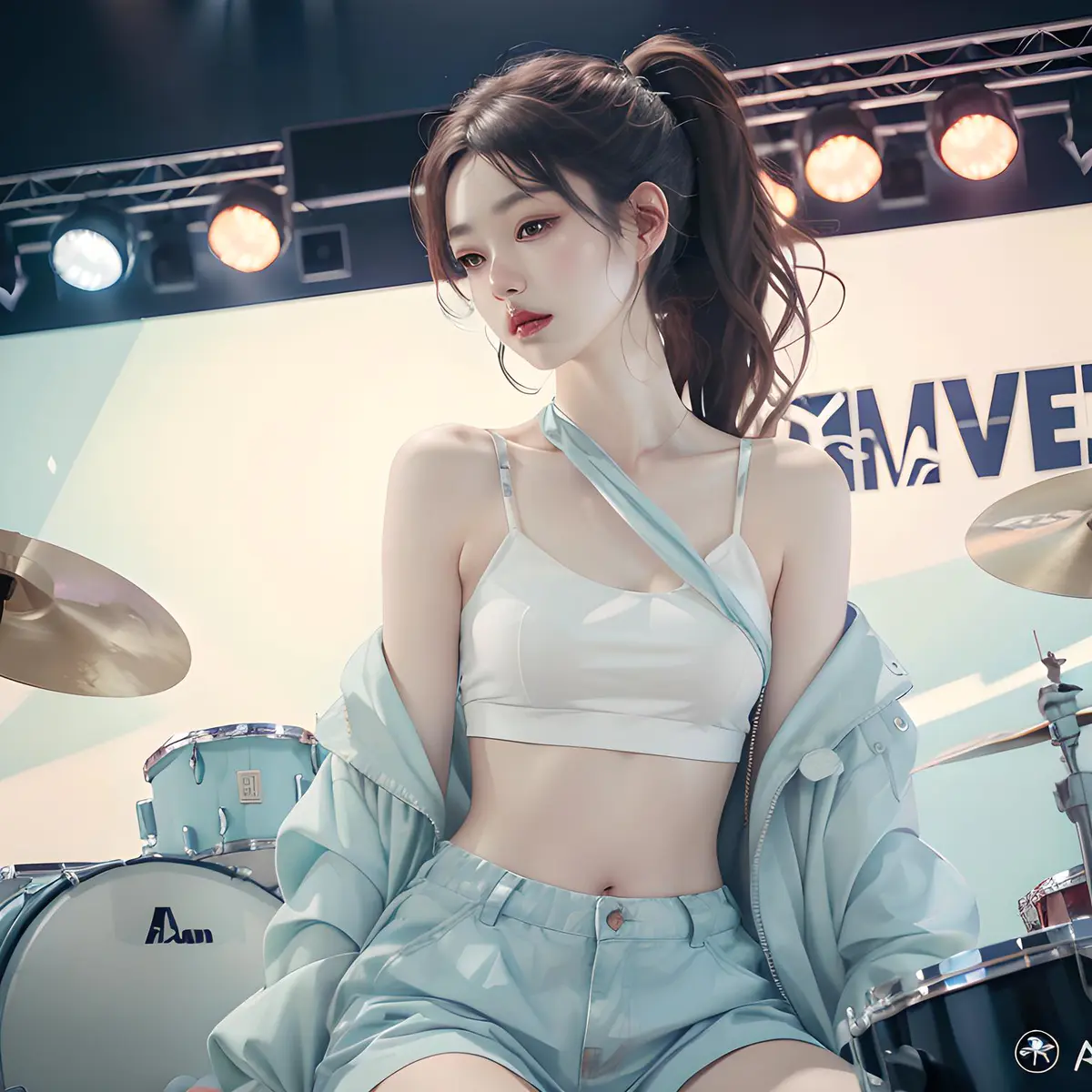 杰作,逼真,8k 超高清,超细致,超逼真,质量最佳,自信的女鼓手,不对称的短发型,左侧有小马尾巴,用可爱的蝴蝶夹固定,微微的笑容,3/4 视角,穿着薄荷绿色细肩带露脐上衣,超大号淡紫色西装外套,高腰淡蓝色短裤,用完美的技巧和精力击鼓,专业架子鼓带有定制的柔和色外壳包装,舞台燃烧,鼓组后面有可控的火焰效果,动感使用紫色、粉色和青色 RGB 聚光灯营造戏剧性氛围的音乐会场地采用现代舞台设计、以运动模糊捕捉光线反射的多个碰撞槌拍摄、使用佳能 EOS R5 拍摄、85mm f/1.4 镜头、专业演播室照明、戏剧性的边缘光在轮廓周围营造光环效果、背景元素略微模糊的浅景深、舞台灯光中的美丽六角形散景、突出面部细节的完美曝光、突出面部细节的完美曝光、电影般的完美曝光颜色分级,强调柔和色调对抗深色地点