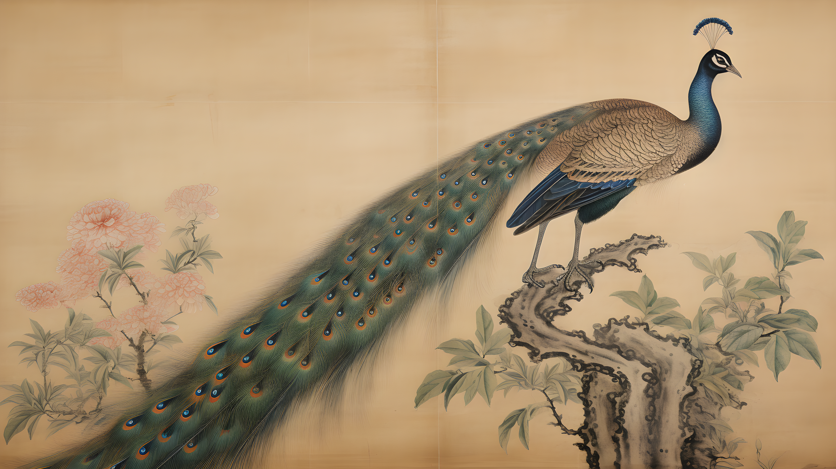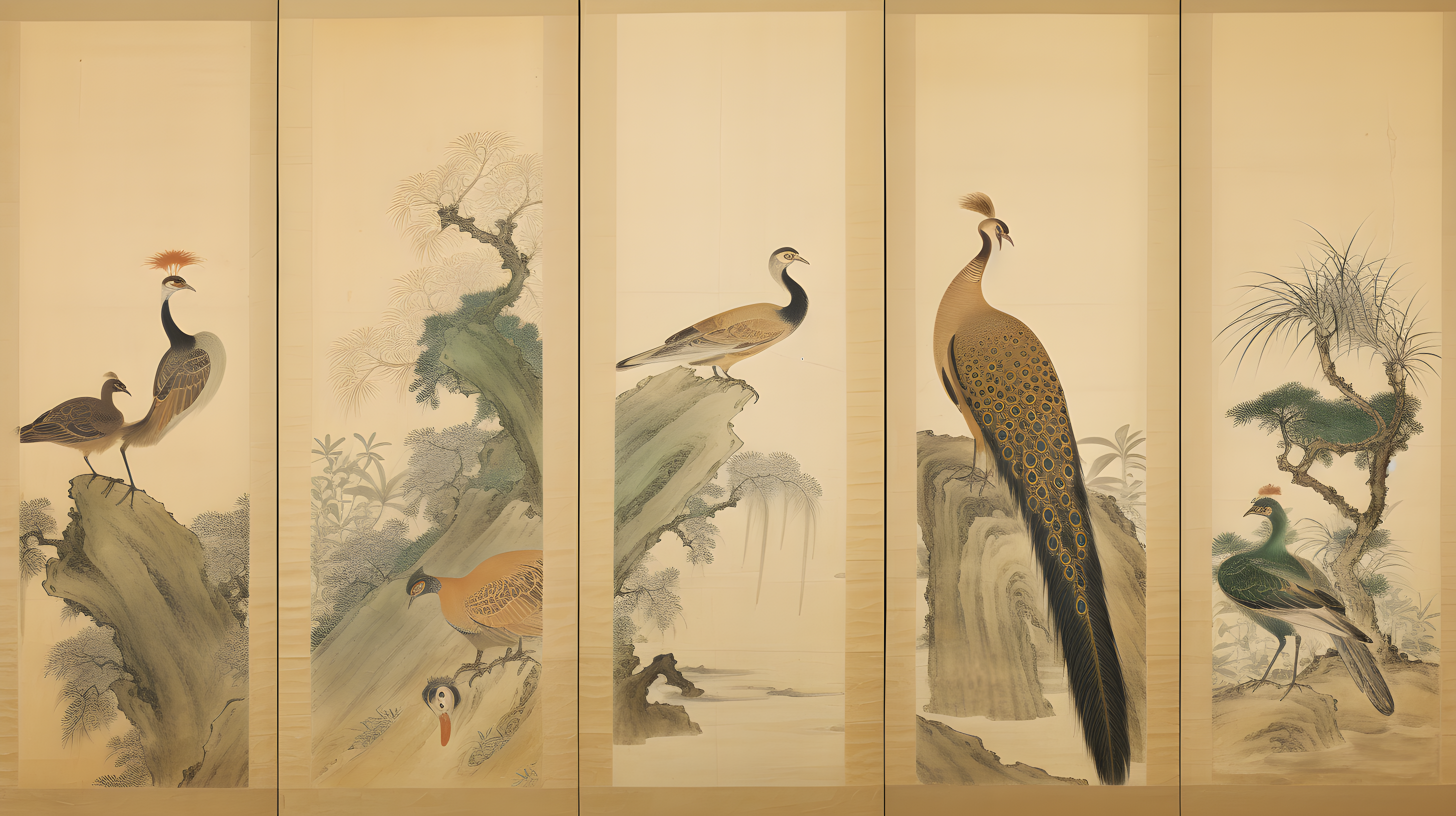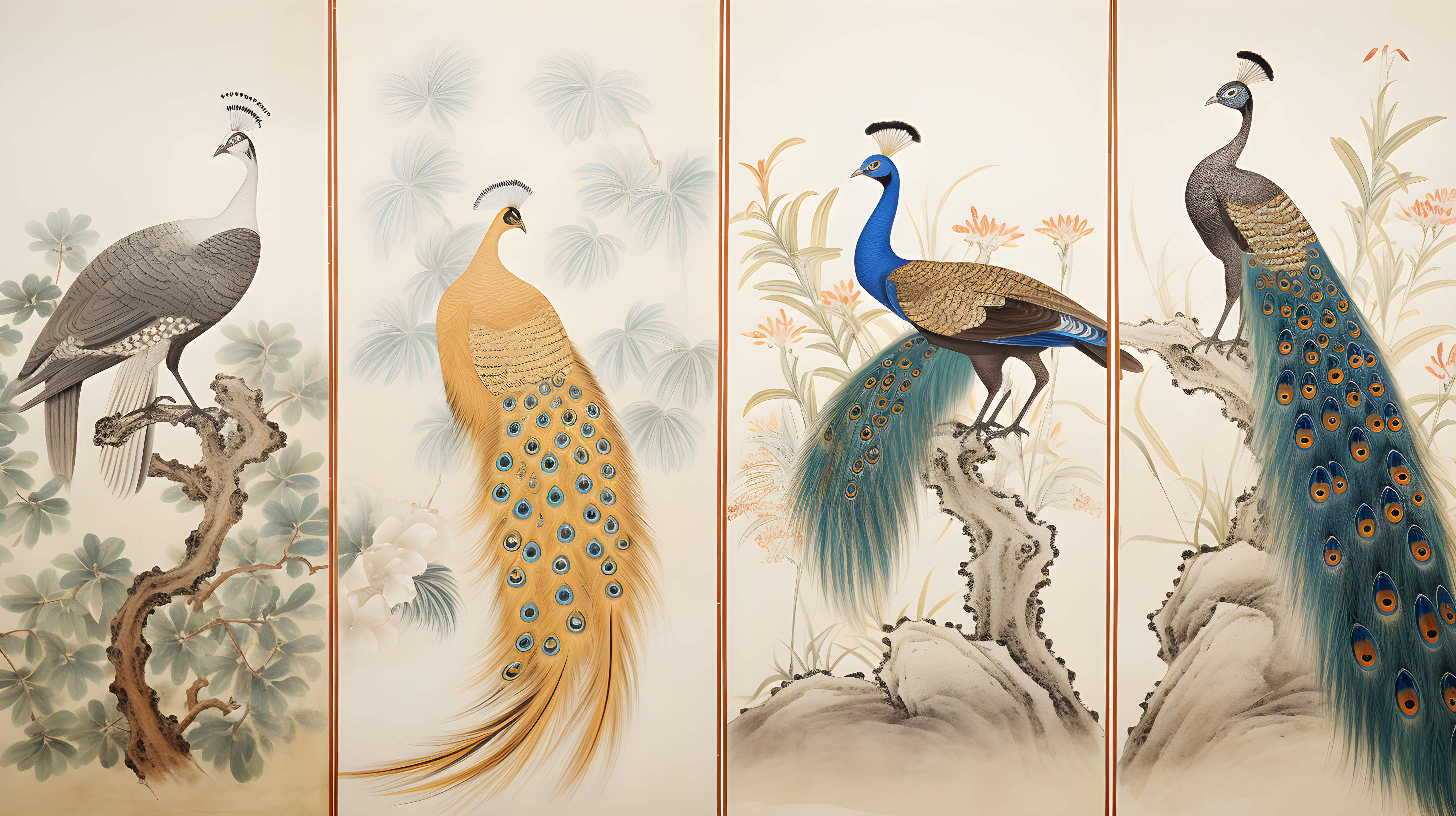 金孔雀、色彩斑斓的羽毛和修长的尾羽长尾雉、以自然主义的方式