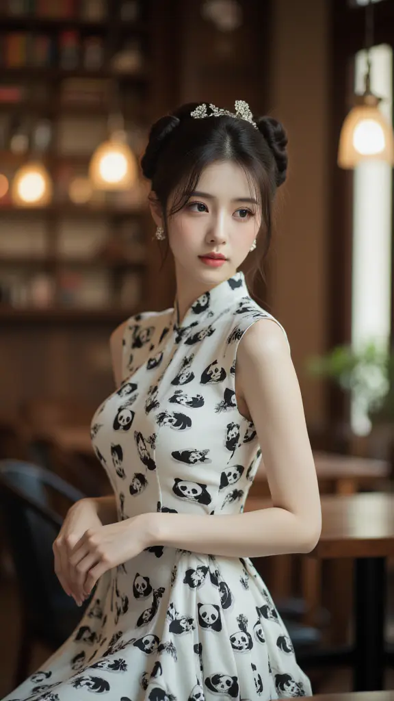 A person wearing a white and black patterned dress with panda designs. Interior setting of a restaurant or cafe, likely dimly lit. White and black tones dominate the image, creating a soft and elegant atmosphere. Photographic portrait.