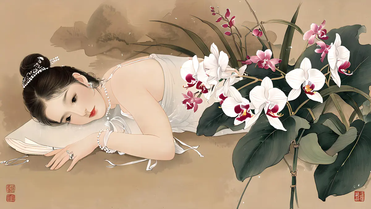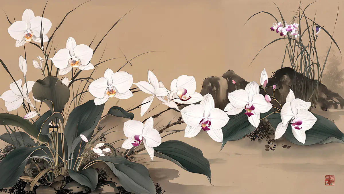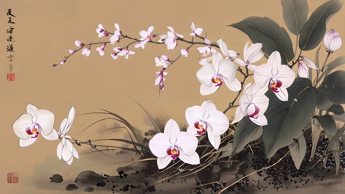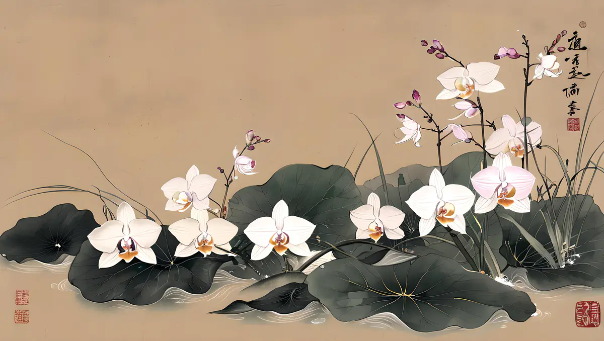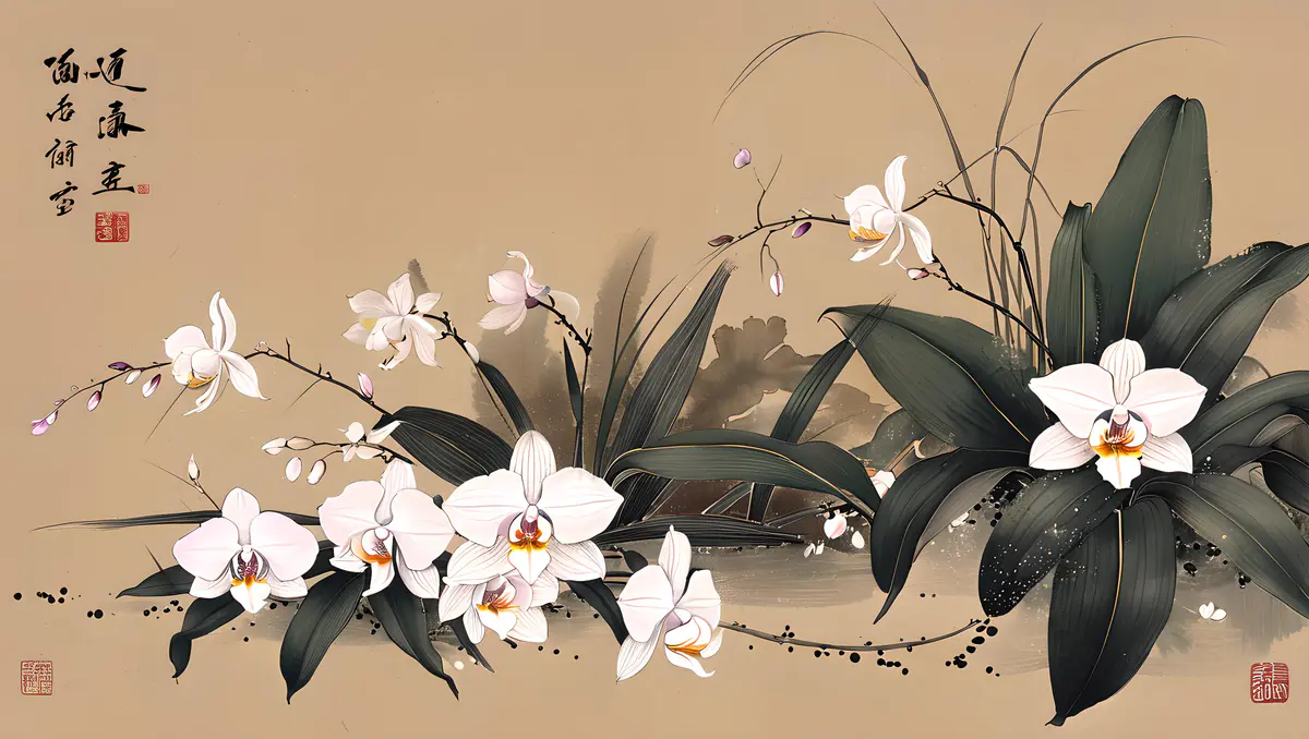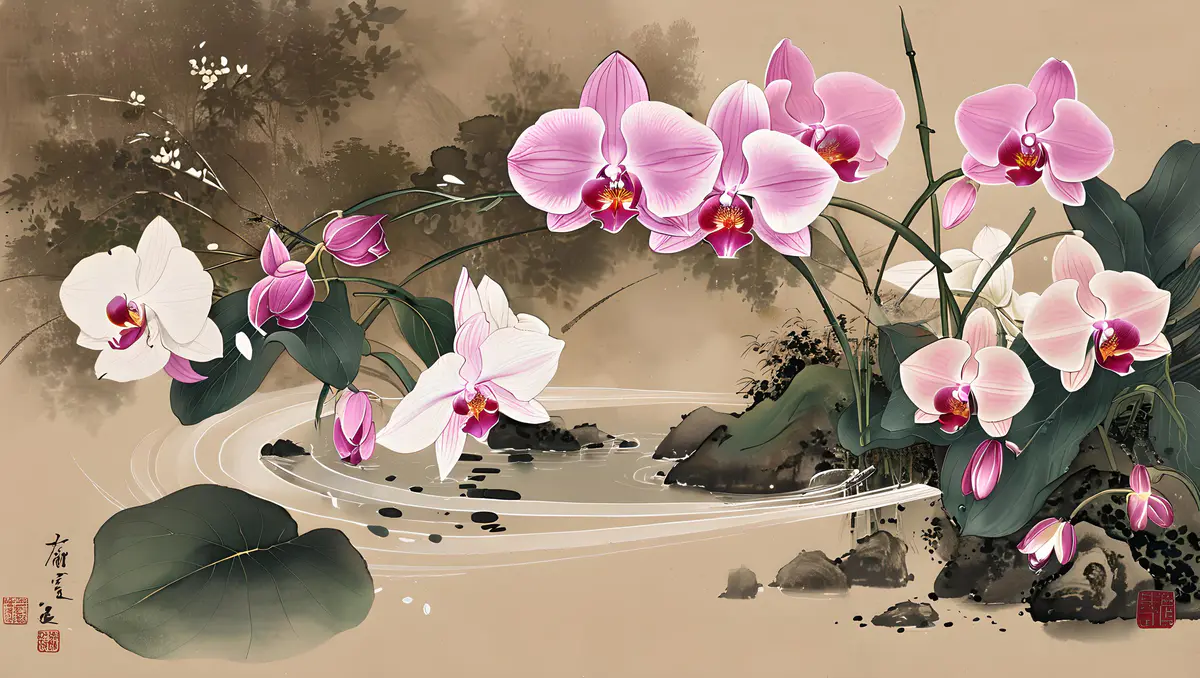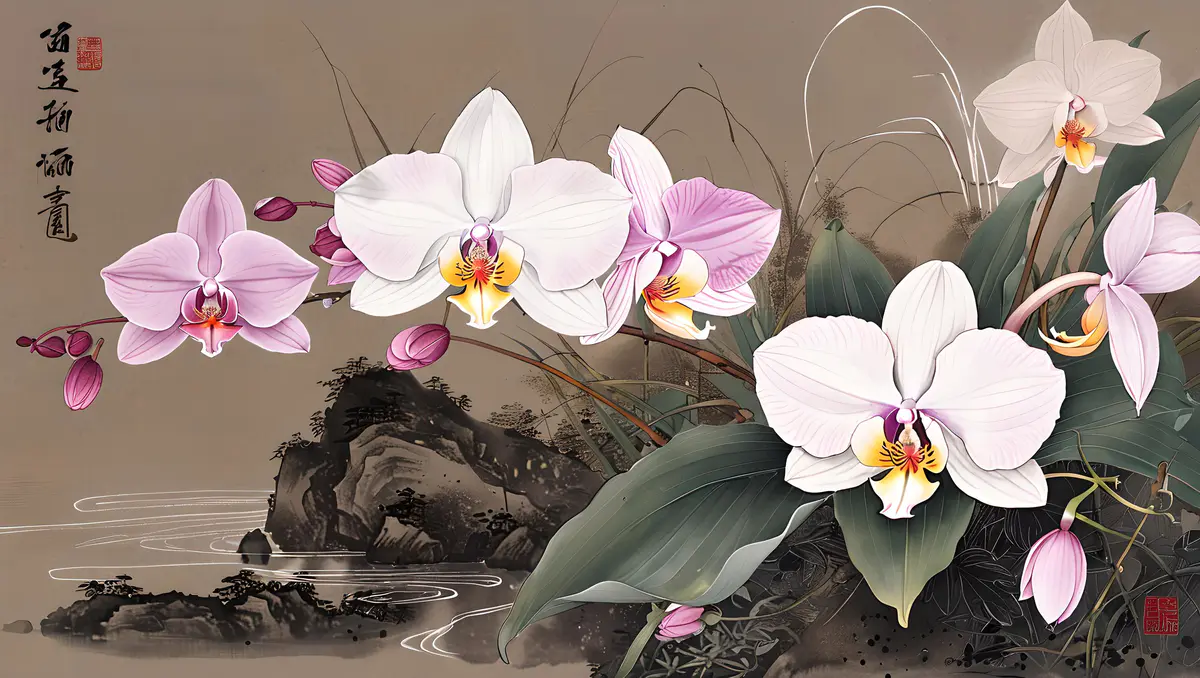 兰花的花朵形态多样,有单瓣、复瓣之分,颜色丰富,包括白、黄、绿、紫、红等多种色彩,以及复色和斑纹品种,各具风姿。花瓣薄而透明,质地细腻,排列整齐,有的品种花瓣边缘还微微卷曲,显得尤为精致。花心中常有雄蕊和雌蕊,雄蕊数目众多,花丝细长,花药饱满;雌蕊则位于花朵中央,柱头明显。具有中国画的风格、它细节精致,色彩优雅,捕捉自然光线、背景是一幅水墨山水画、加题词、印章、8K、高分辨率。