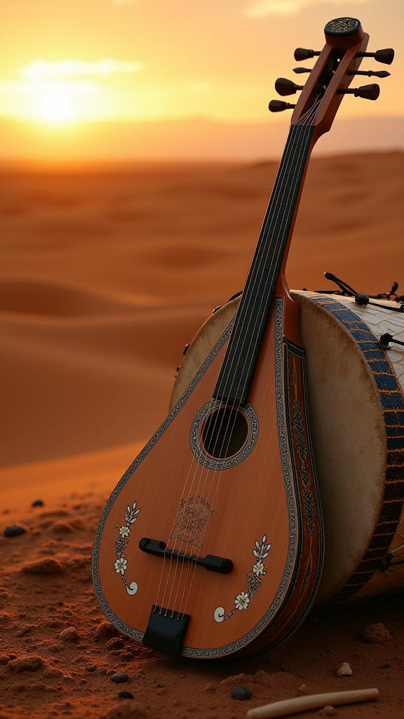 塔克拉玛干沙漠边缘的一片胡杨林,金黄的树叶在夕阳下燃烧。乐器上仿佛还回荡着刀郎木卡姆那苍凉、高亢而又充满生命力的旋律,画面中充满了声音的余韵与沙漠绿洲的炽热情感。