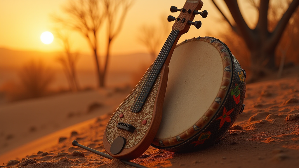 一把精致的维吾尔族热瓦普和一面手鼓静静地靠在一起,仿佛刚刚结束一场酣畅的演奏。