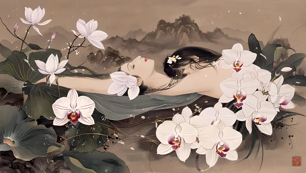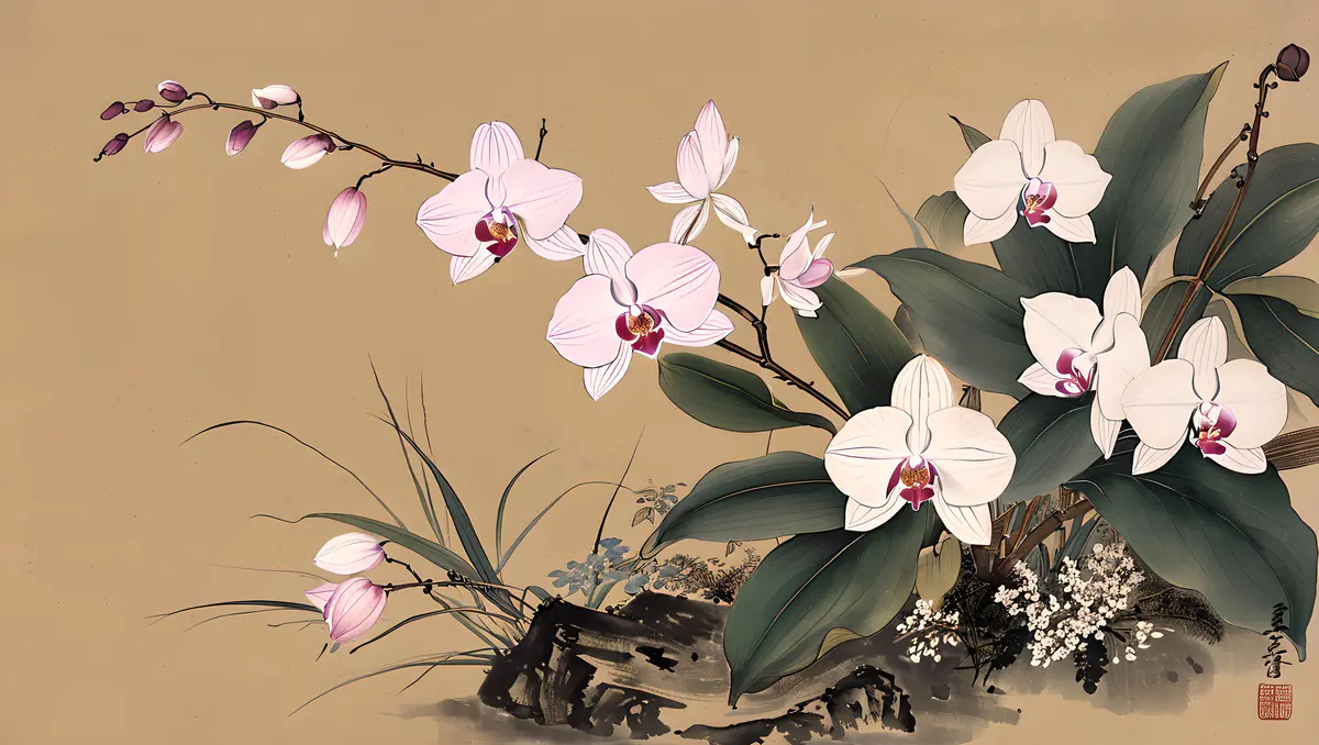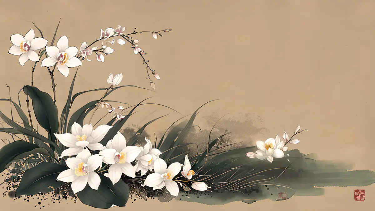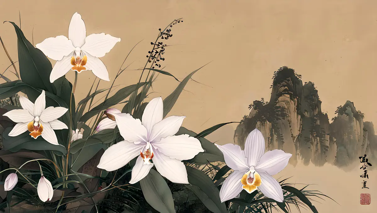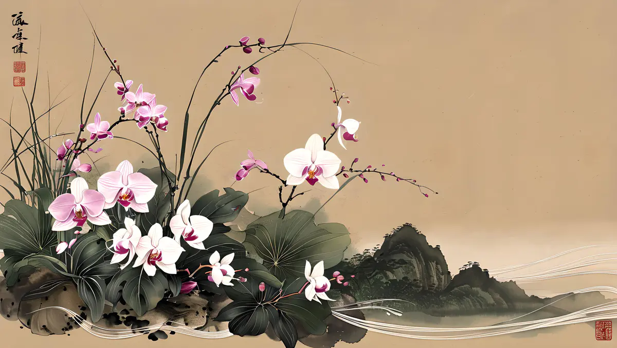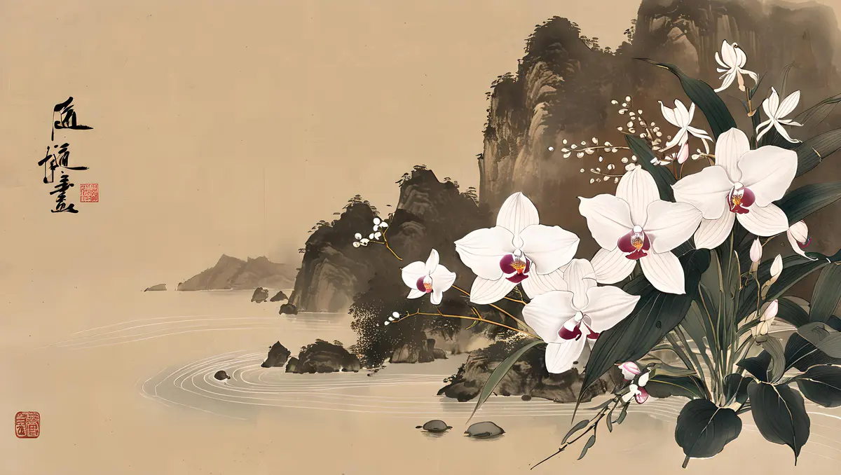 兰花的花朵形态多样,有单瓣、复瓣之分,颜色丰富,包括白、黄、绿、紫、红等多种色彩,以及复色和斑纹品种,各具风姿。花瓣薄而透明,质地细腻,排列整齐,有的品种花瓣边缘还微微卷曲,显得尤为精致。花心中常有雄蕊和雌蕊,雄蕊数目众多,花丝细长,花药饱满;雌蕊则位于花朵中央,柱头明显。具有中国画的风格、它细节精致,色彩优雅,捕捉自然光线、背景是一幅水墨山水画、加题词、印章、8K、高分辨率。
