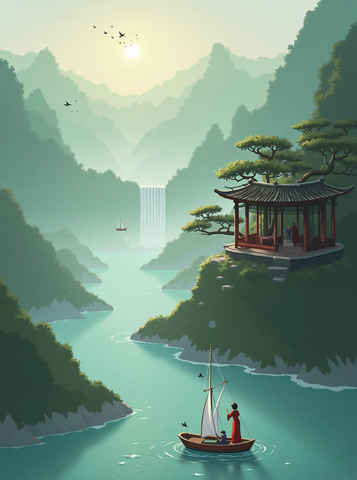 在阳光迷眉之下,一座座青山在云雾缭绕连绵不断,山峰上瀑布象银河落九天般隊入雾渊间。对岸半山上隐约看见,一座由红柱子顶盖着流璃瓦的古阁楼里,有一位古装美女在欣赏瀑布。清彻的河流挂着山峰的倒影有一条小帆船在慢慢划过。一群小乌在帆顶略过