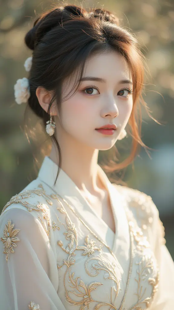 A woman adorned in a traditional, ornate white dress with gold accents and intricate designs. Soft lighting with a blurred natural setting. White and gold hues dominate the image, creating a warm and elegant atmosphere. Photorealistic digital art.
