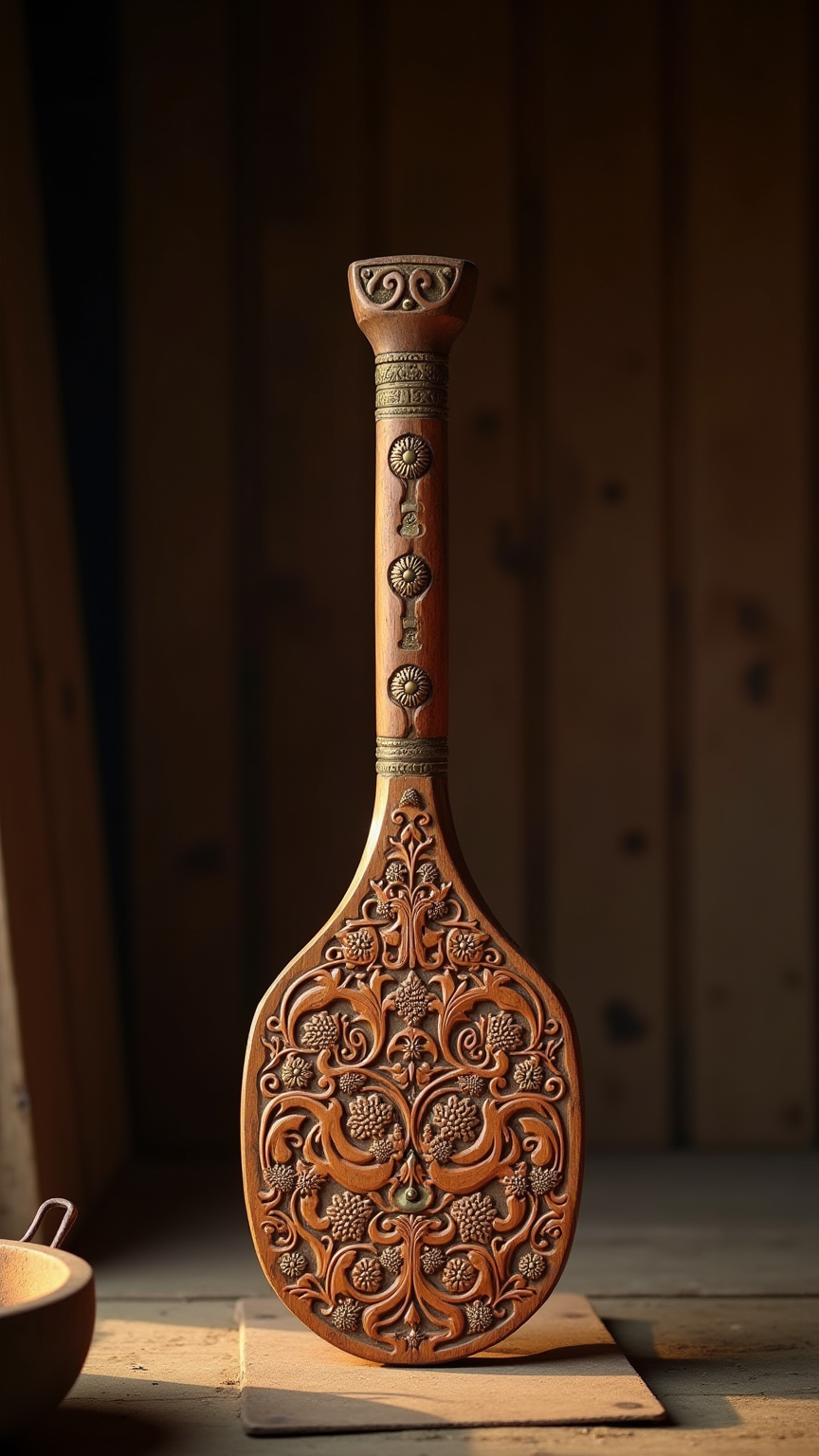 这是一件维吾尔族传统桑木馕坑铲,是维吾尔族木质器具非遗工艺的经典体现。以坚硬耐温的桑木为原料,铲身通体雕刻缠枝葡萄纹与几何宝相花纹,纹样繁复细腻,充满浓郁的民族艺术风格;铲柄与边缘镶嵌黄铜饰片,既加固了器具结...查看更多