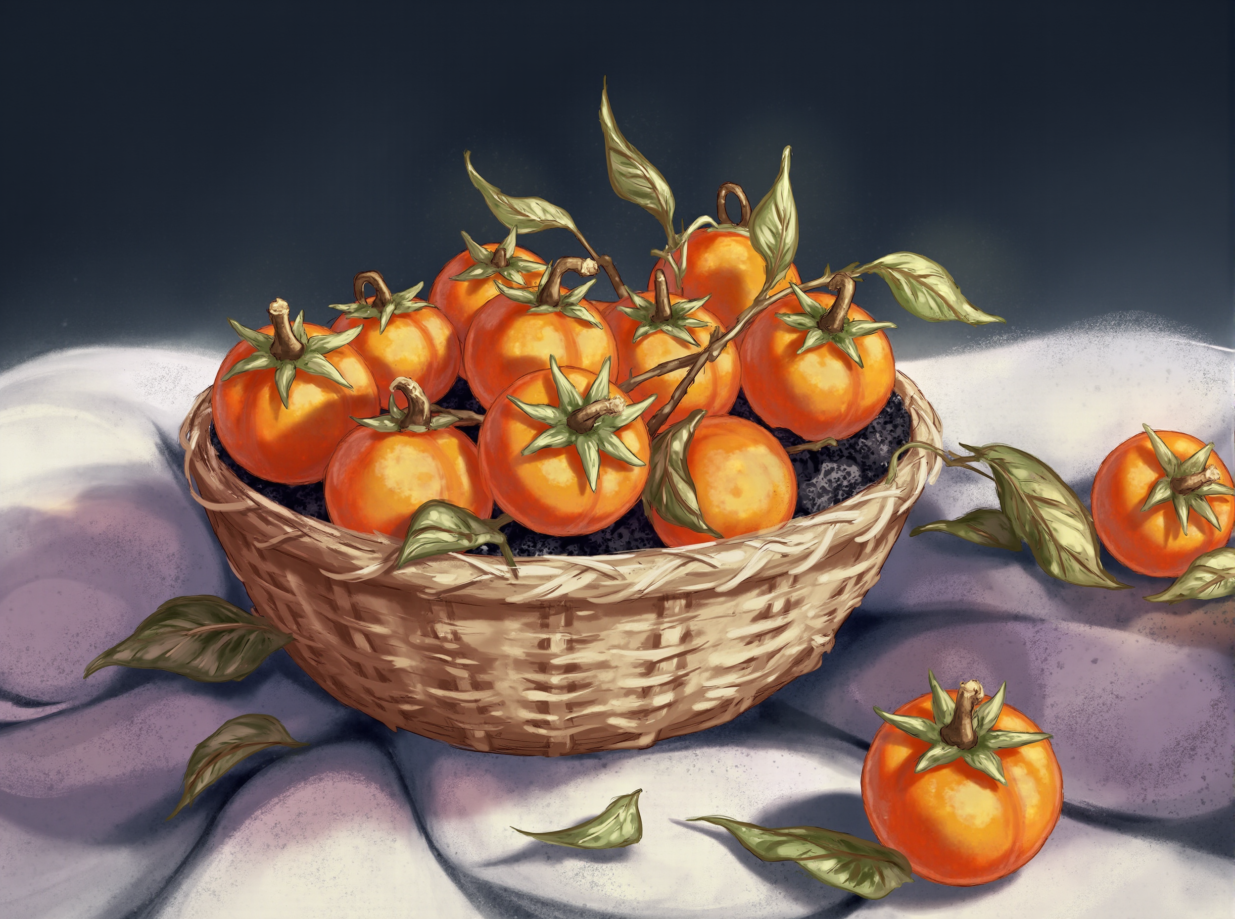 柿叶脉络以干擦技法塑造斑驳肌理,篮筐竹纹用侧锋笔触刻画编织质感,桌面阴影渐隐如薄雾,赋予画面静谧的时光感。仿佛秋日农舍一隅,熟透的柿子正等待被酿作甜糯的柿饼,静谧中暗藏丰收的喜悦。