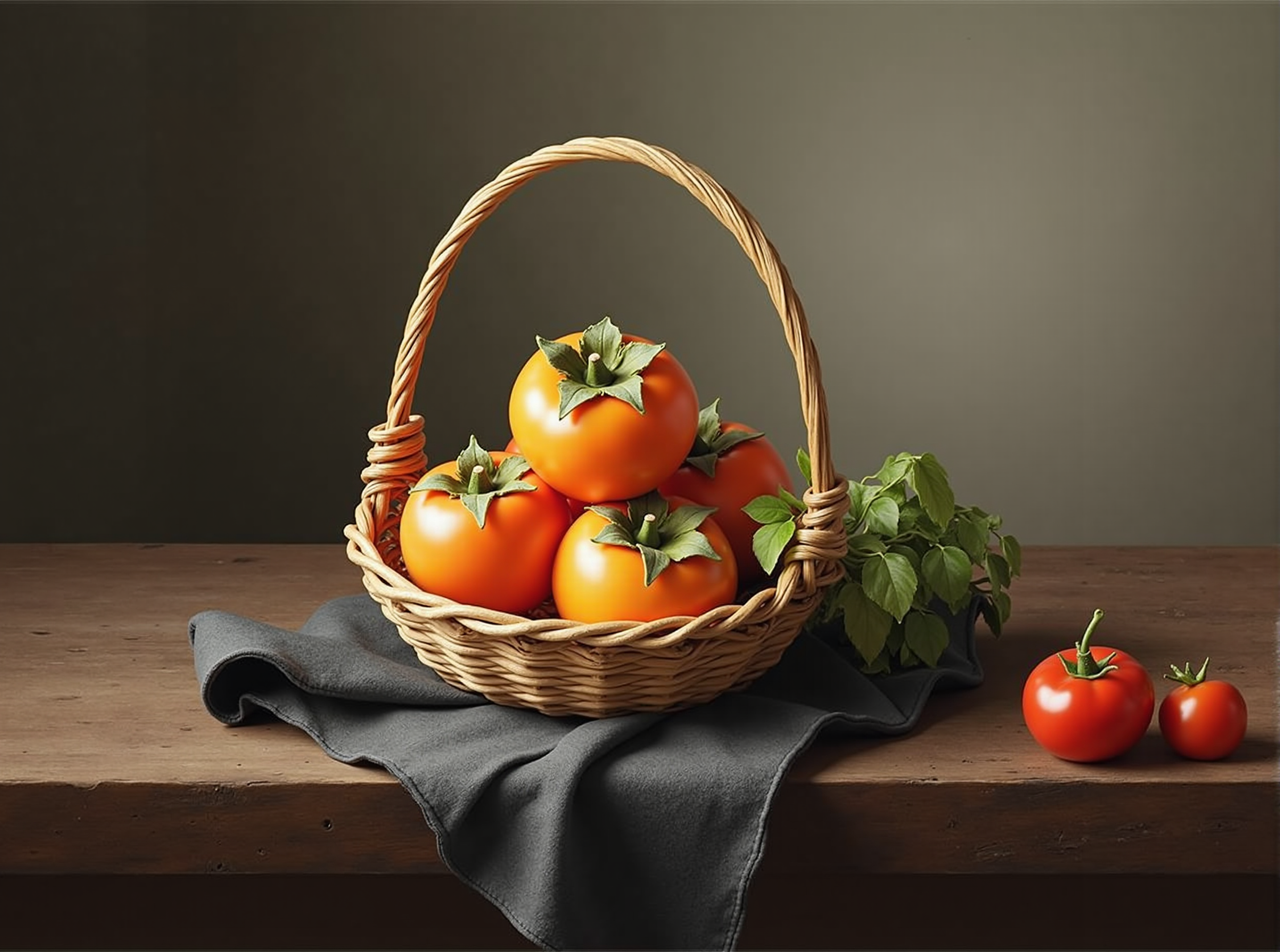 A basket of ripe persimmons and tomatoes on a wooden surface. A dark, textured background with a hint of green. Warm tones of orange and brown, soft lighting. Digital painting with an oil-like texture.