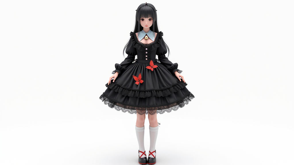 画面风格融合了洛丽塔服饰的甜美精致与些许暗黑风格,白色背景的简洁性使得人物的服饰细节和造型被清晰地展现出来,整体氛围既甜美可爱又带有一丝独特的个性魅力。