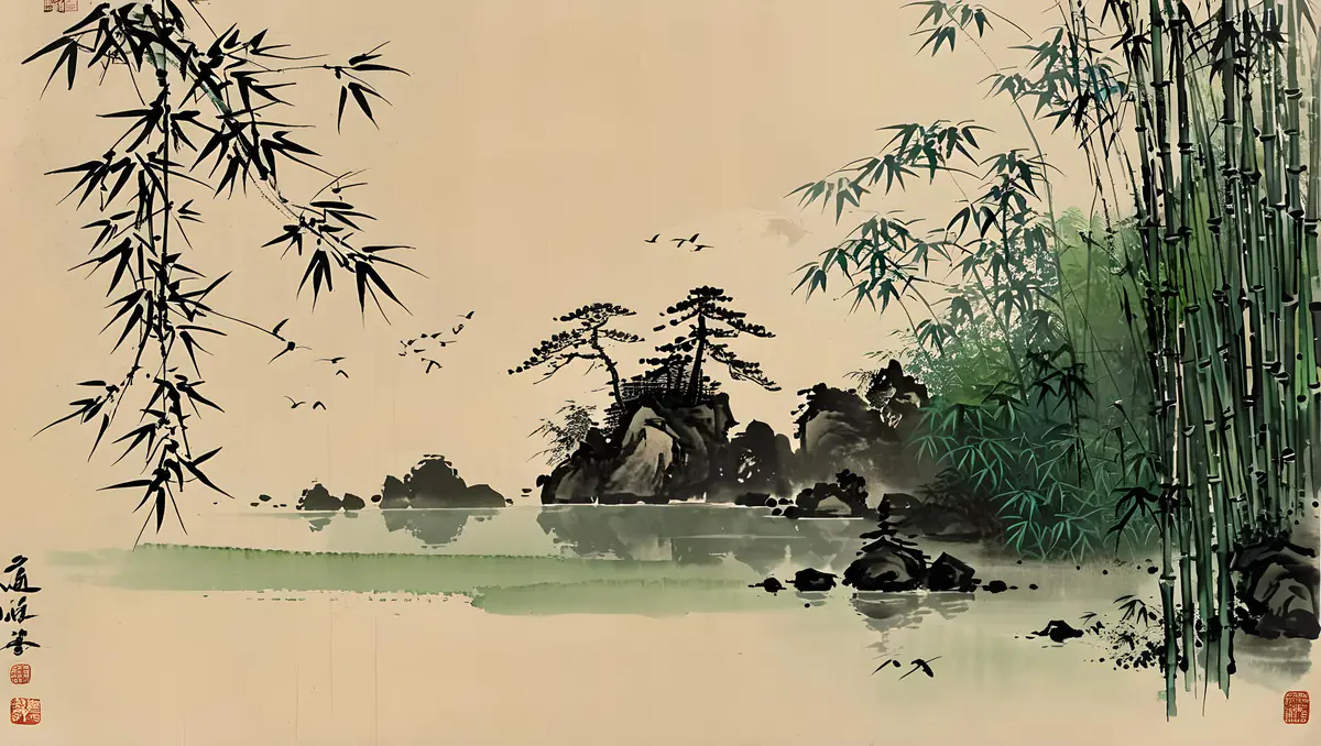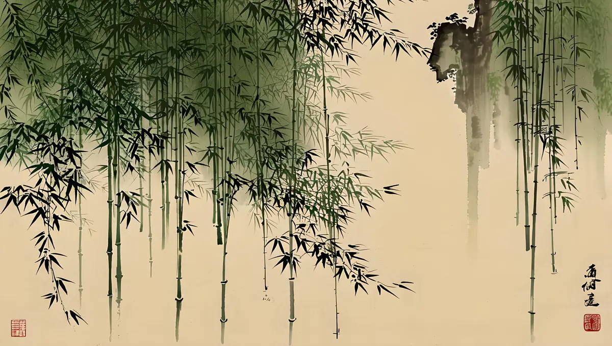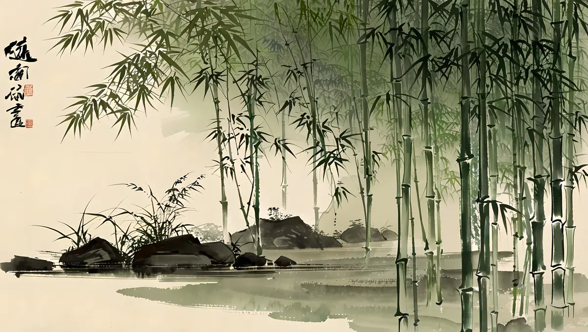 竹子以其挺拔修长的身姿而著称,竹枝杆修直挺拔,远望绿竹林,郁郁苍苍,给人一种清新、自然、宁静的感觉。竹子山水画,竹都是疏落有致,竹随风动,神韵飘逸,枝节攀高,无惧风雨,一年四季,青绿永驻,总是给人一种生机勃勃和清新秀丽之感。