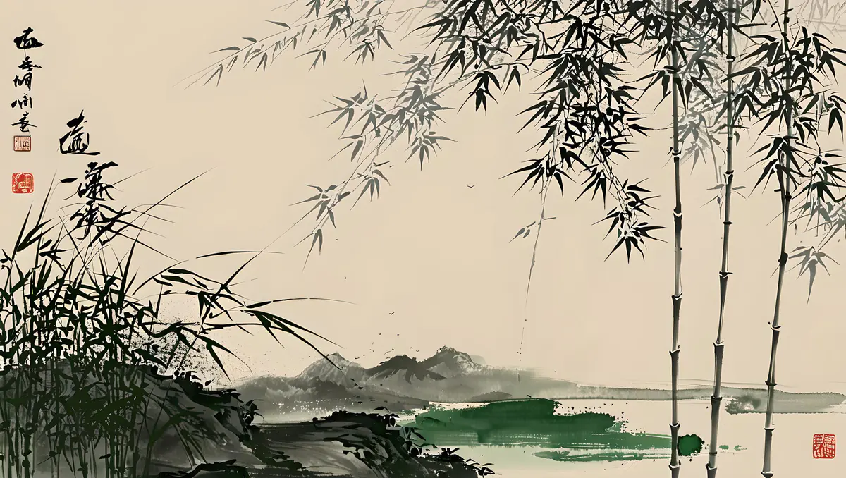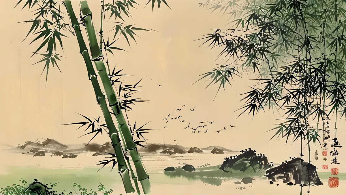 竹子以其挺拔修长的身姿而著称,竹枝杆修直挺拔,远望绿竹林,郁郁苍苍,给人一种清新、自然、宁静的感觉。竹子山水画,竹都是疏落有致,竹随风动,神韵飘逸,枝节攀高,无惧风雨,一年四季,青绿永驻,总是给人一种生机勃勃和清新秀丽之感。
