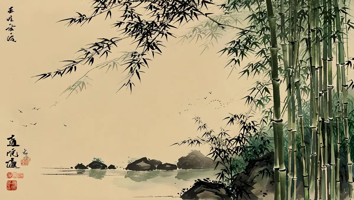 竹秆上分布着明显的竹节,这些竹节使得竹子在外观上呈现出分节的特点,同时也增强了竹子的抗压和抗弯能力。清风吹拂下,山水映照下,竹子的那种清劲遒媚,飘逸潇洒的风姿表现得淋漓尽致