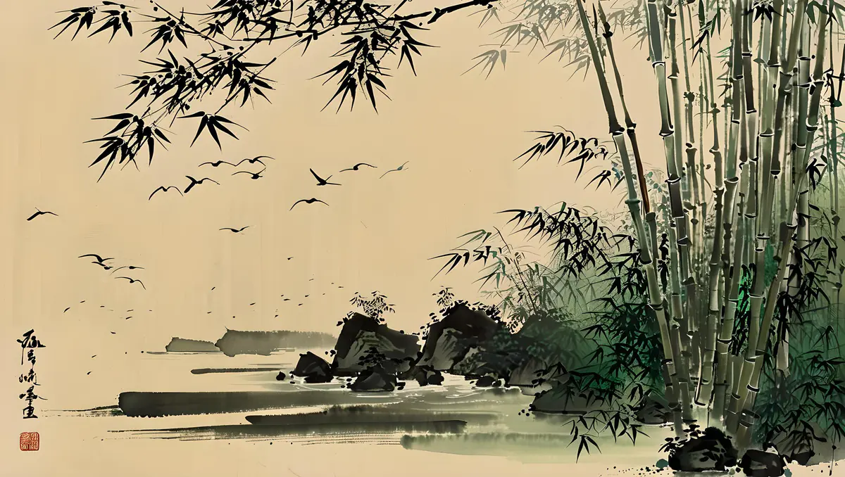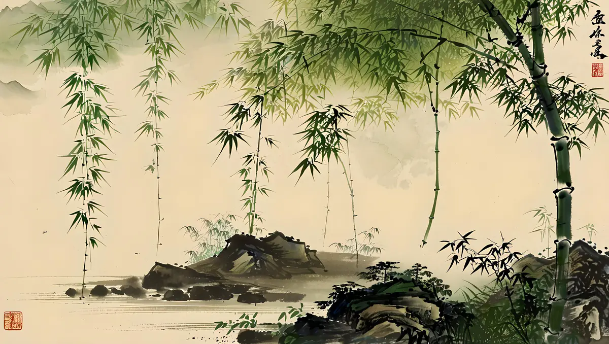 竹子以其挺拔修长的身姿而著称,竹枝杆修直挺拔,远望绿竹林,郁郁苍苍,给人一种清新、自然、宁静的感觉。竹子山水画,竹都是疏落有致,竹随风动,神韵飘逸,枝节攀高,无惧风雨,一年四季,青绿永驻,总是给人一种生机勃勃和清新秀丽之感。
