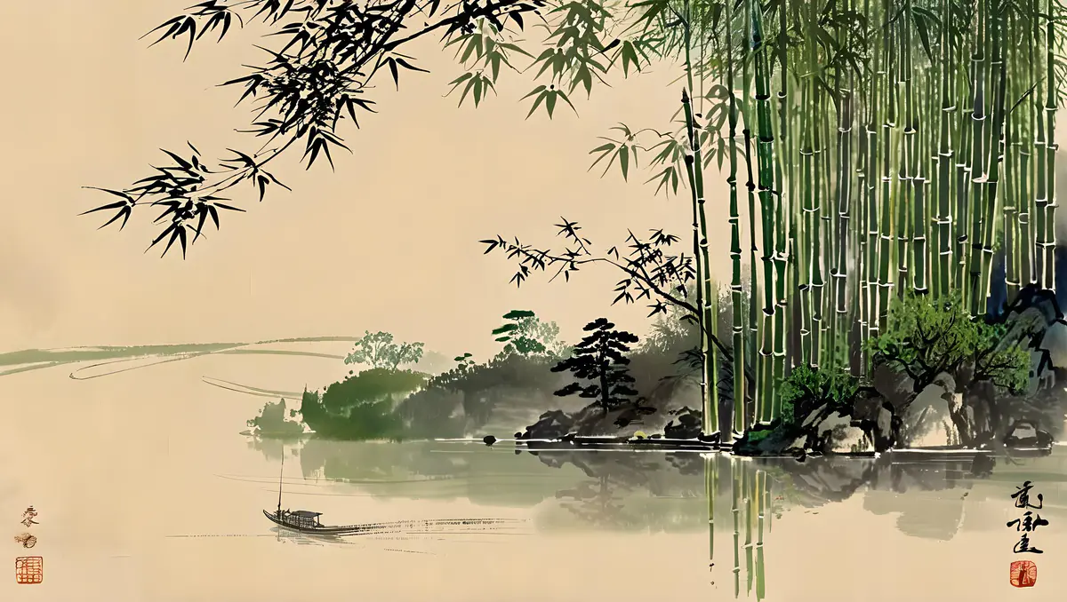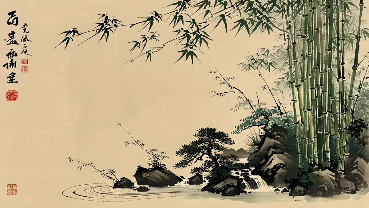竹子以其挺拔修长的身姿而著称,竹枝杆修直挺拔,远望绿竹林,郁郁苍苍,给人一种清新、自然、宁静的感觉。竹子山水画,竹都是疏落有致,竹随风动,神韵飘逸,枝节攀高,无惧风雨,一年四季,青绿永驻,总是给人一种生机勃勃和清新秀丽之感。
