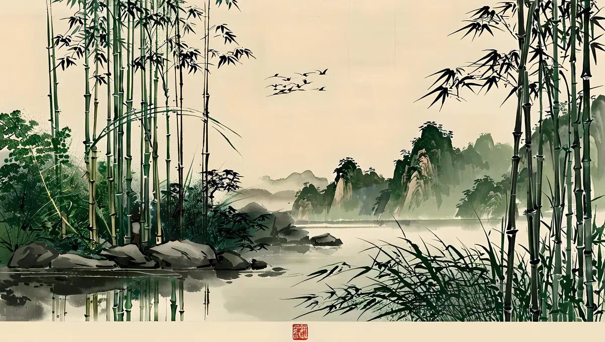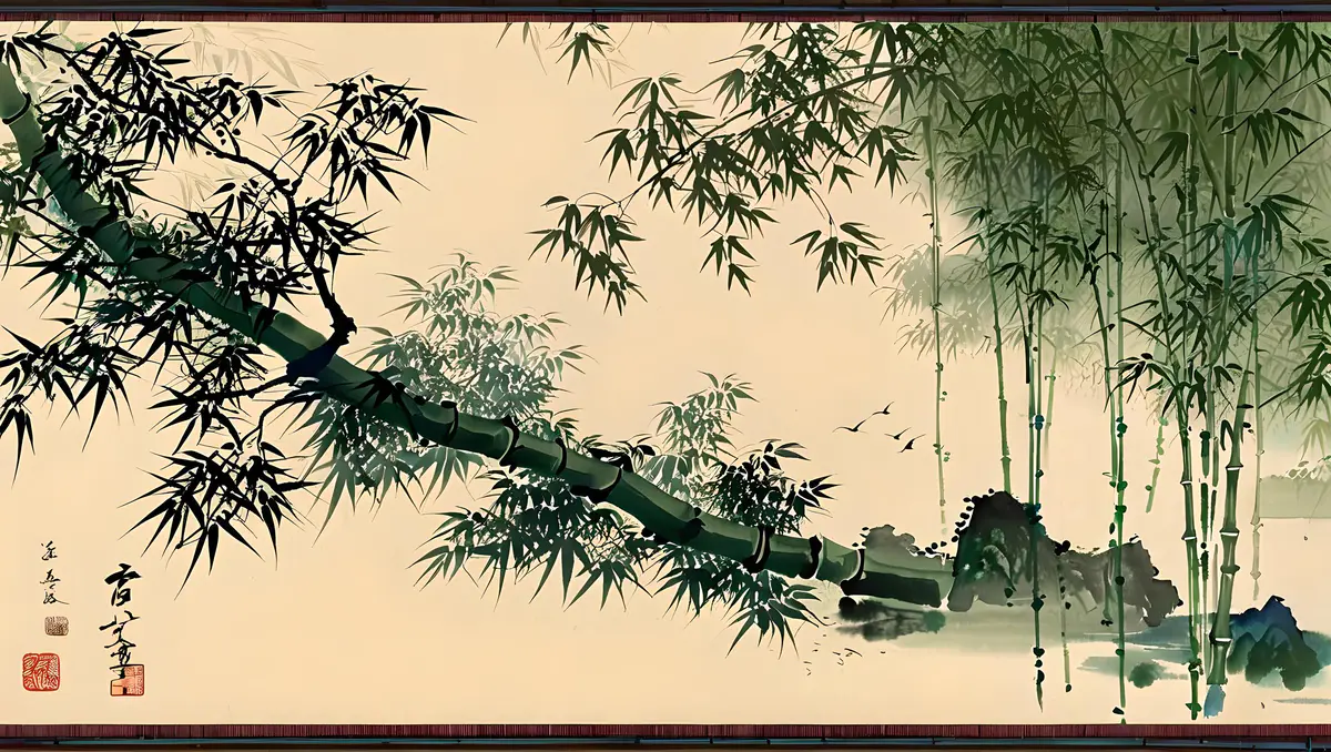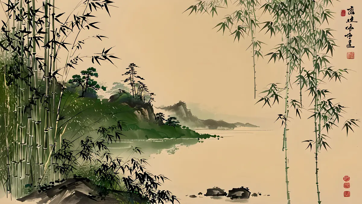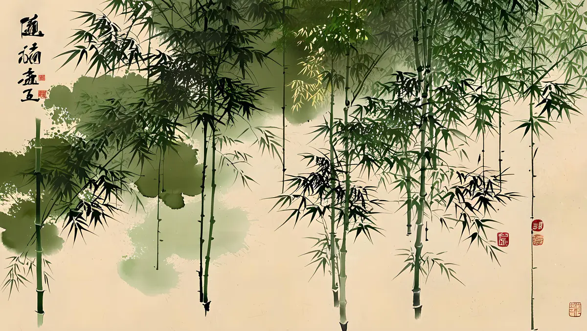 竹子以其挺拔修长的身姿而著称,竹枝杆修直挺拔,远望绿竹林,郁郁苍苍,给人一种清新、自然、宁静的感觉。竹子山水画,竹都是疏落有致,竹随风动,神韵飘逸,枝节攀高,无惧风雨,一年四季,青绿永驻,总是给人一种生机勃勃和清新秀丽之感。